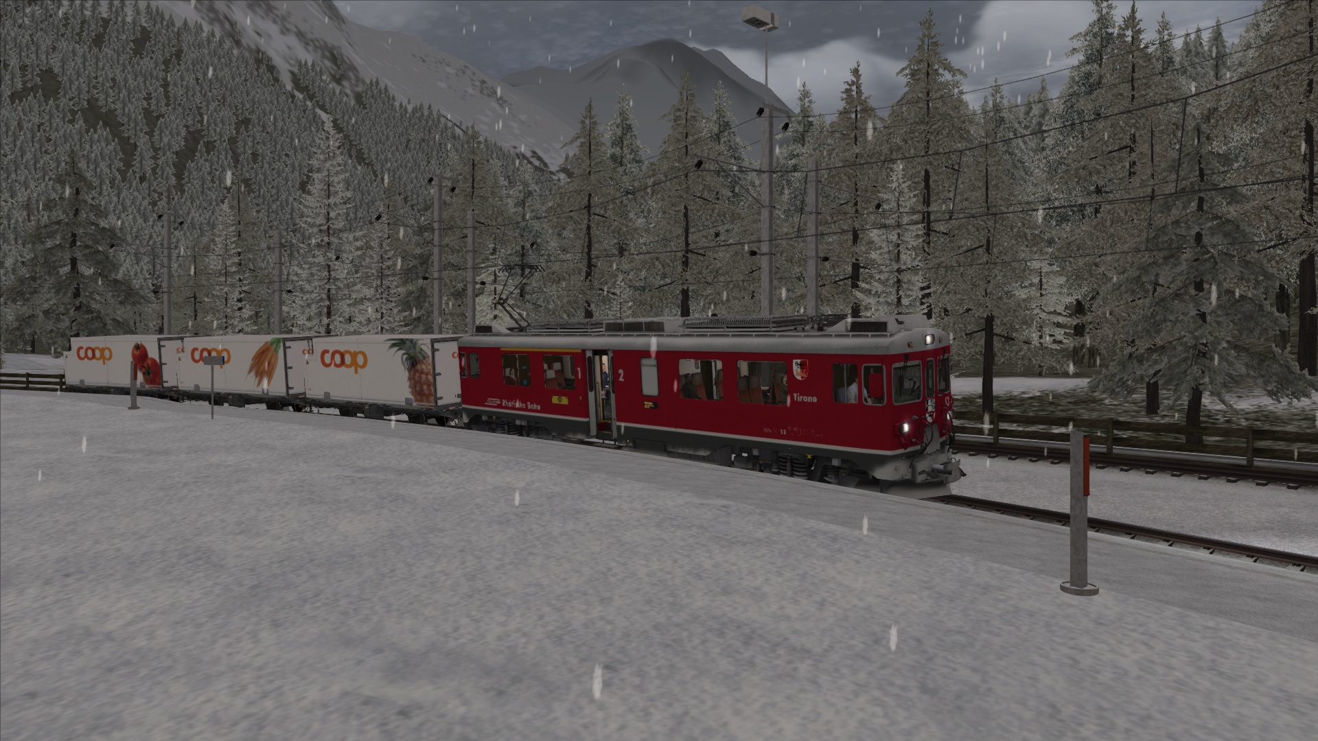 Mischzug von Poschiavo nach Pontresina. Zum Teil,hat es starker Schneefall.