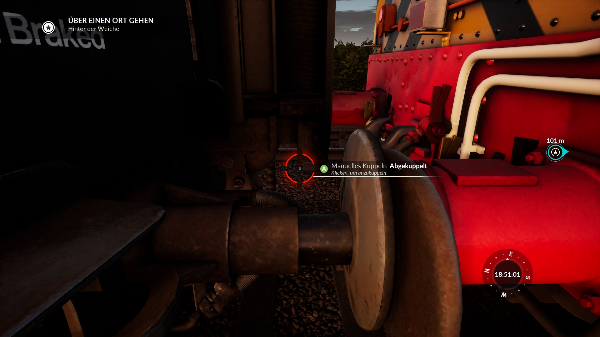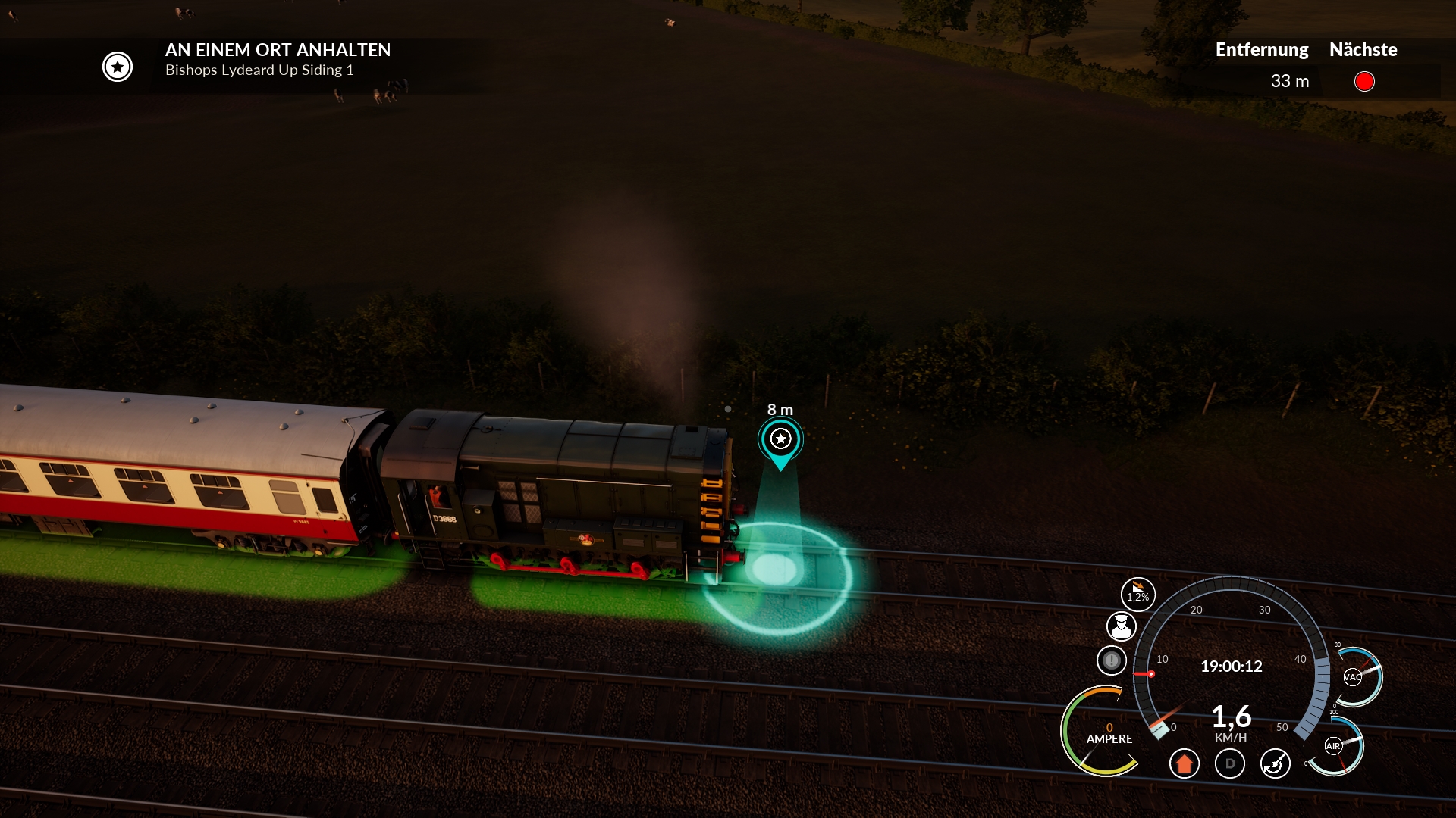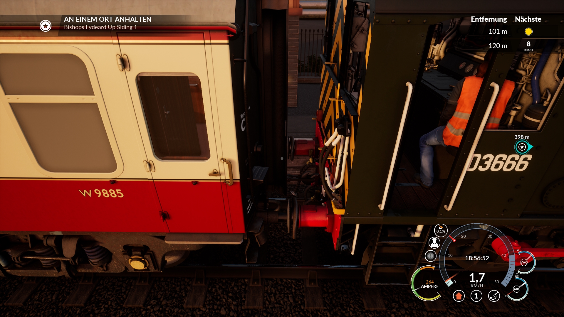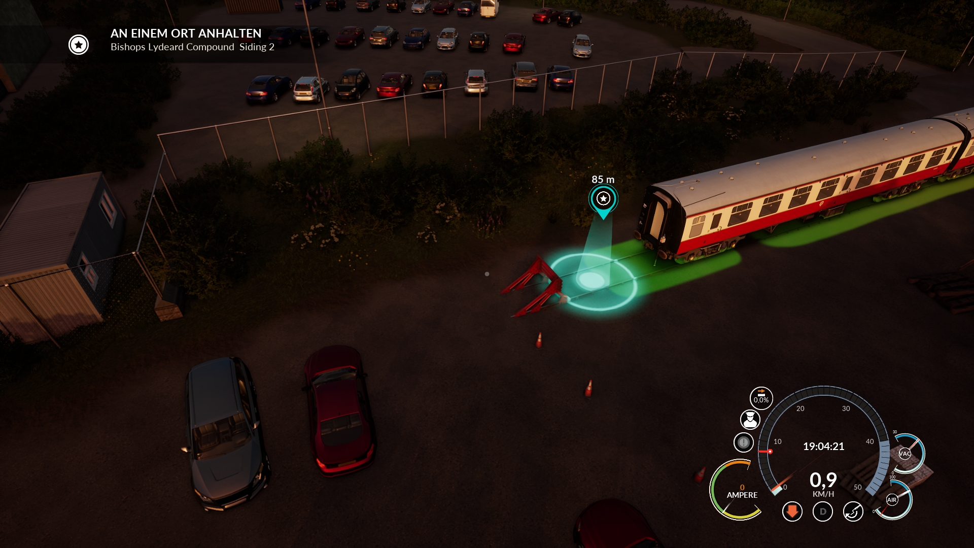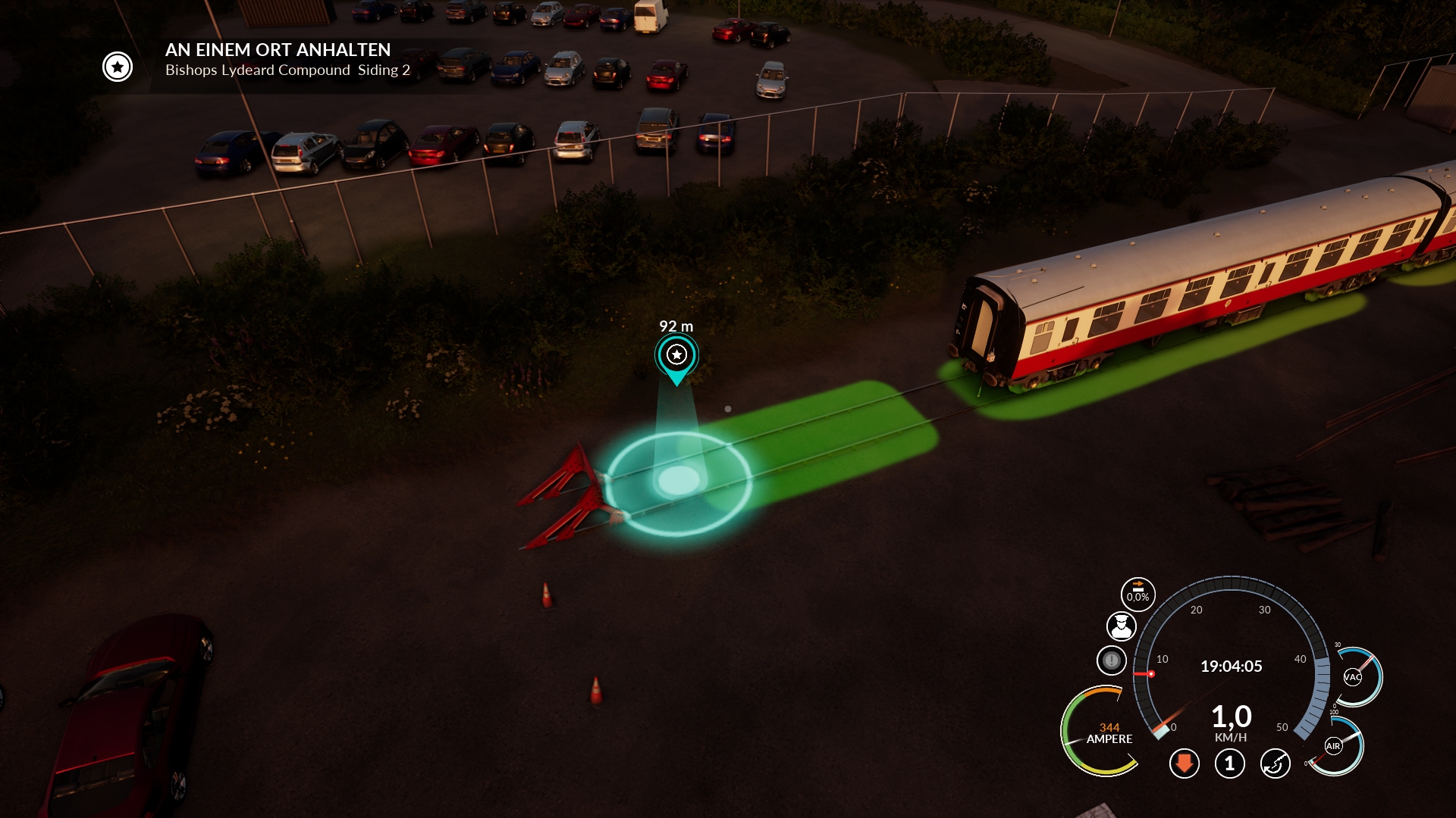 Man achte auf die Entfernungsangaben der Marker und auf die farblichen Flächen um die Waggons abzustellen.