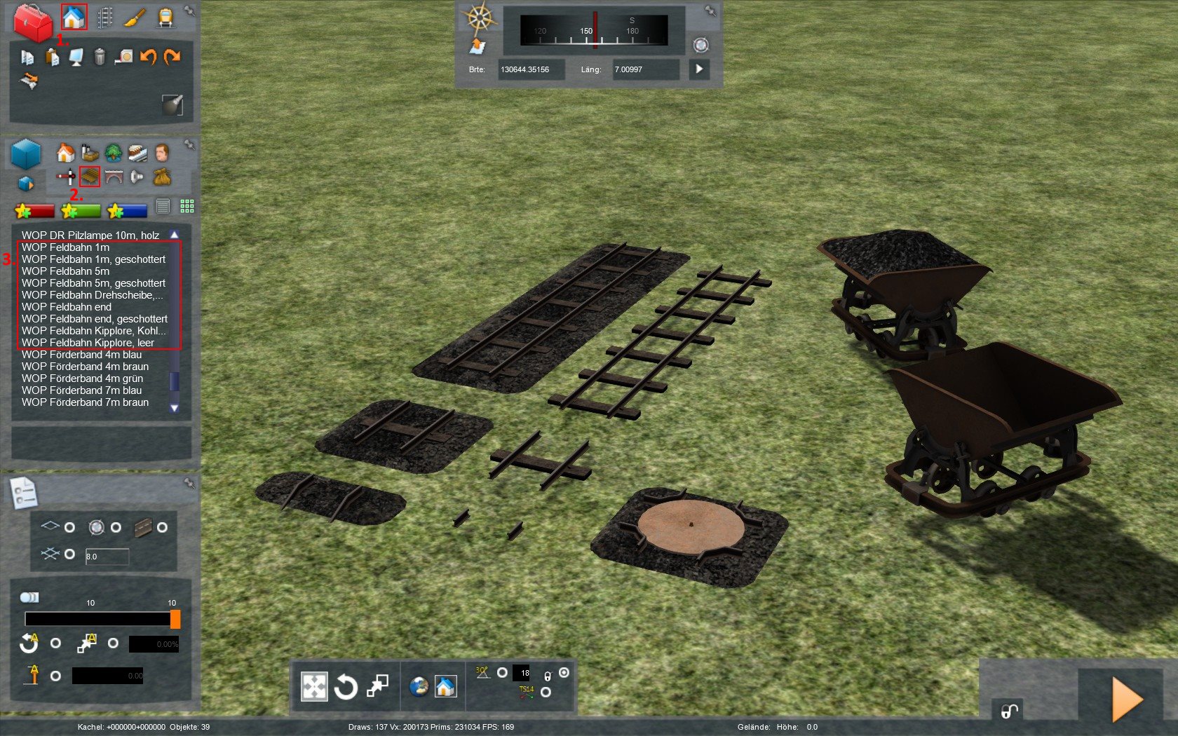 Falls sich jemand mit dem Feldbahnbaukasten beschäftigen möchte, hab ich hier ein paar hilfreiche Bilder als Anleitung erstellt. Beim Platzieren sollte man sich nicht wundern, aber die Gleise werden ebenerdig mit Schienenoberkante platziert und sind nicht kaputt.