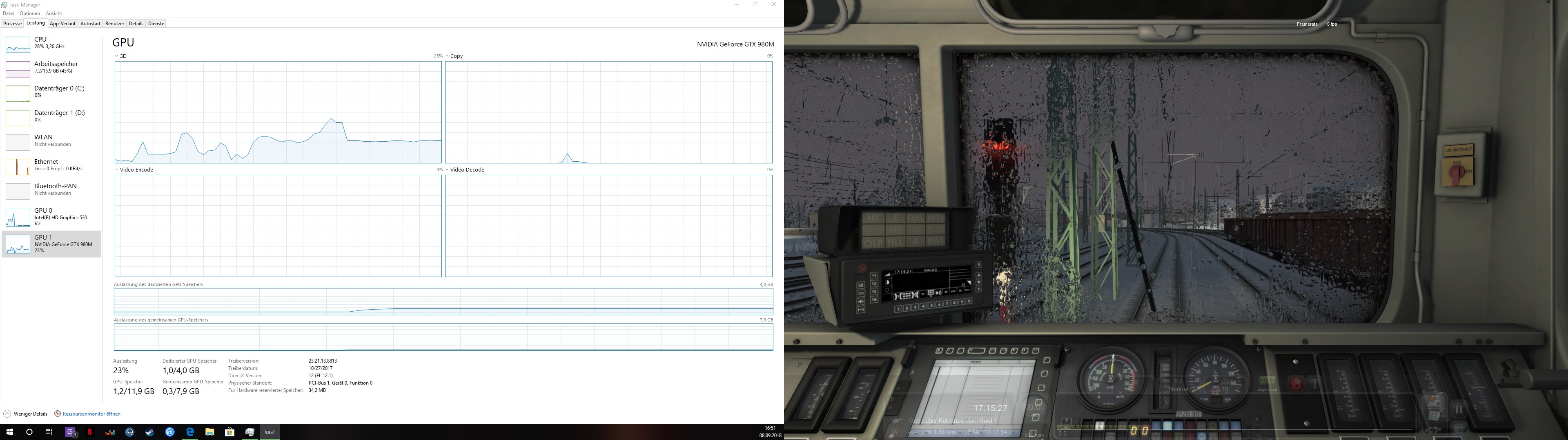 • nein die liegt bei ner Auslastung von 40% wie auch im Screenshot zu sehen ist (GPU1 is die Nvidia Geforce 980m mit 8Gb, GPU0 is ein eiterer Grafik chip von Intel is aber irrelevant da ich garnicht erwarte das er den auch mitnutzt und dürfte den auch nicht brauchen)