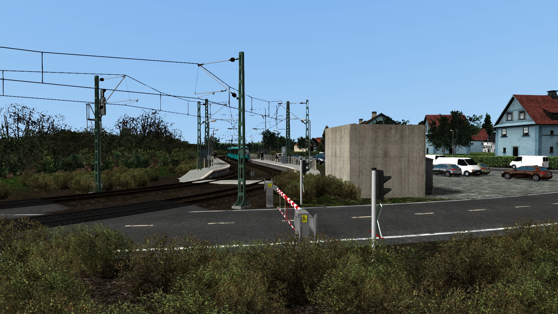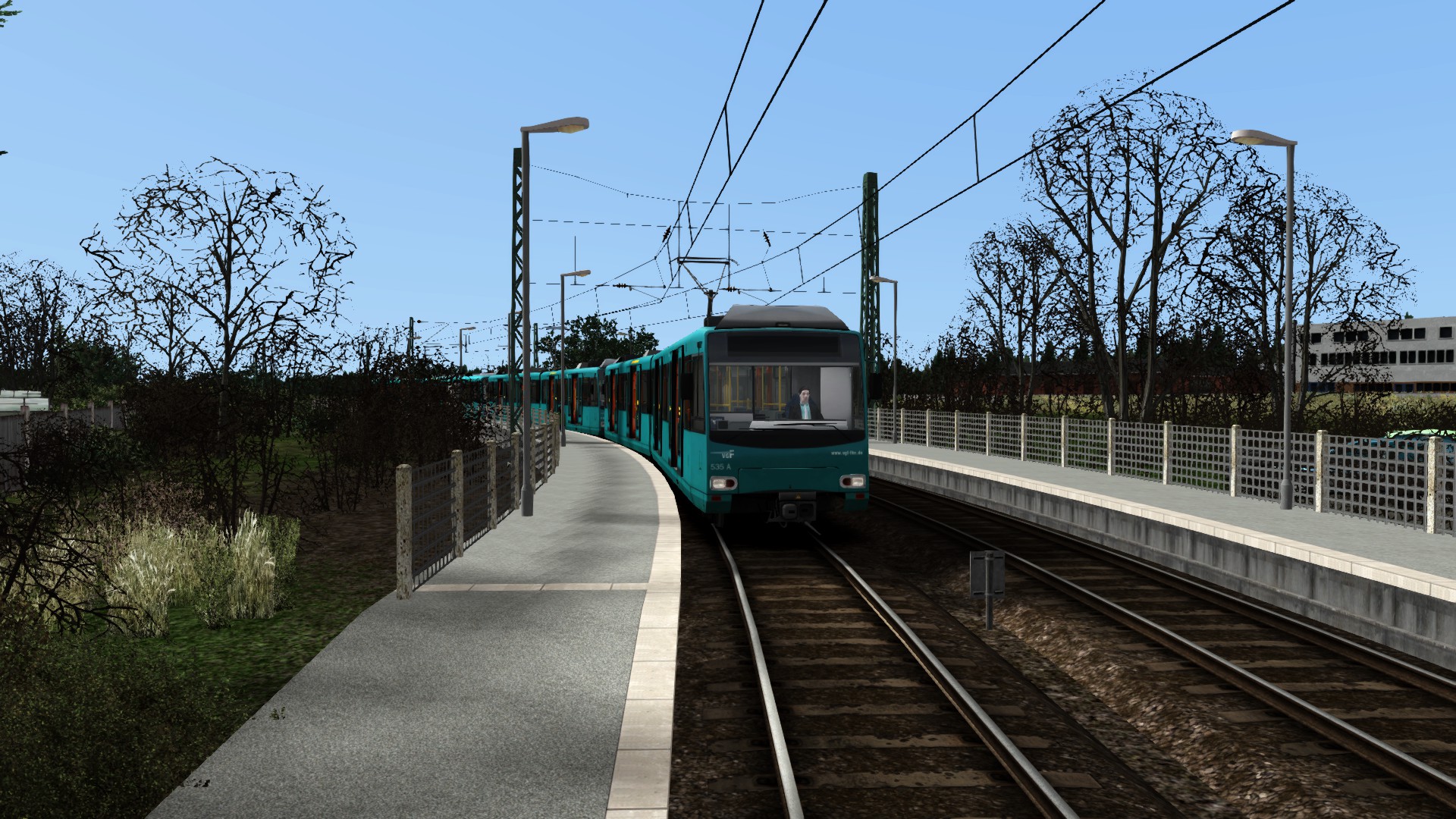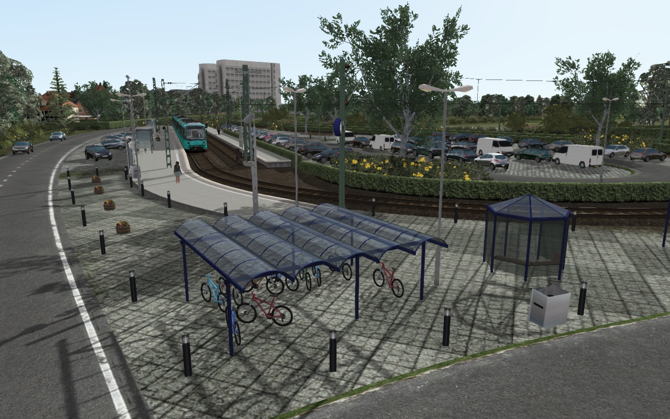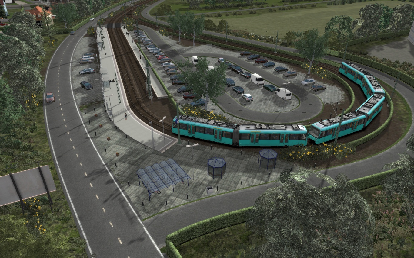 - teilfiktiv ist die Endhaltestelle Wolfartsweier Nord. Tatsächlich gibt es hier eine Wendeschleife, wobei das 2. innere Bahnsteiggleis tatsächlich ein Stumpfgleis ist.