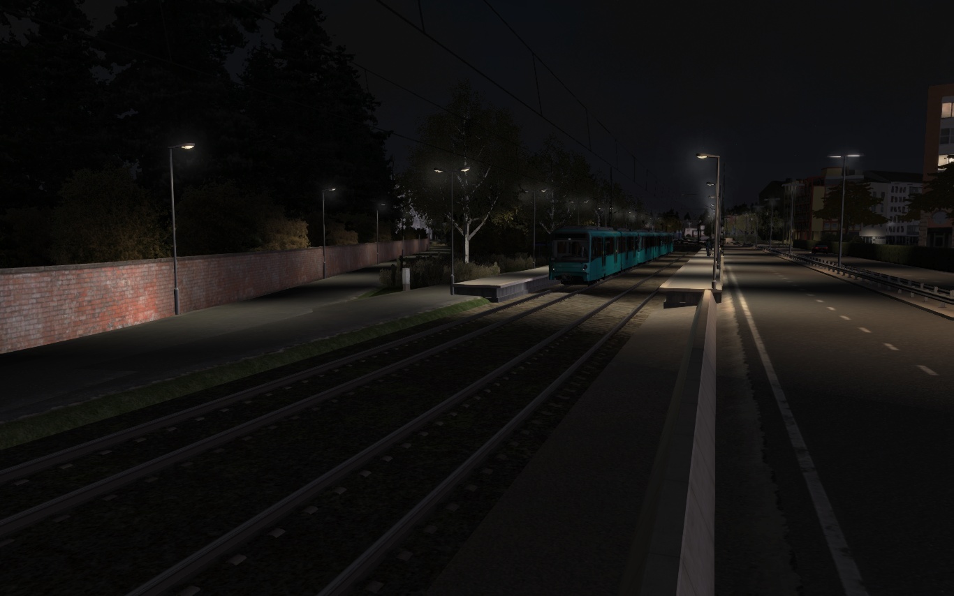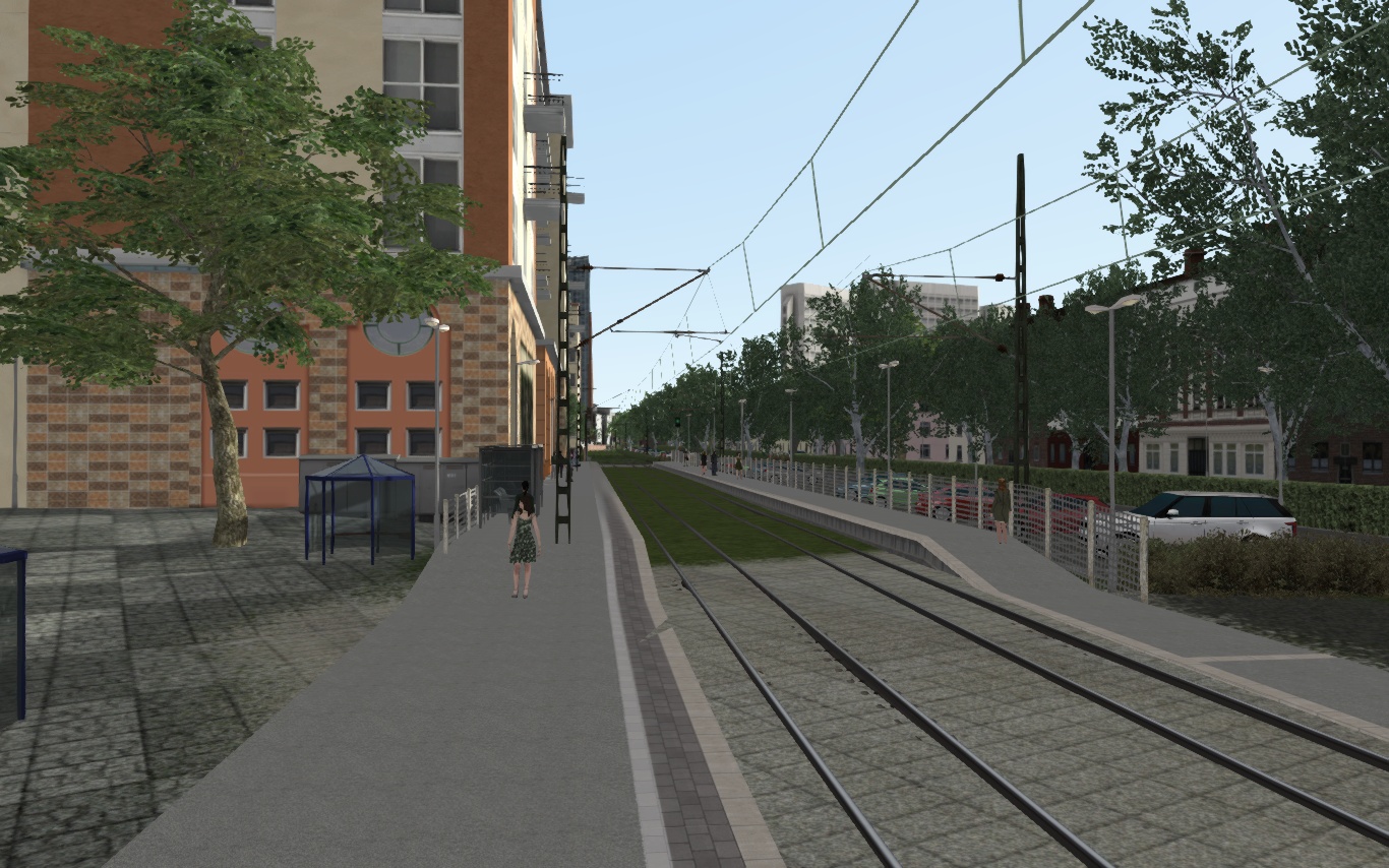 - An der Kreuzung Tullastr. befindet sich real der Südabzweig in Richtung Citypark und Innenstadt. Kurz nach Tullastr. enden die bisher ungenutzten Gleise nun an der fiktiven Station "Schlachthausstr." Ich wollte mal eine "tiefergelegte" Haltestelle ausprobieren (Bahnsteig niveaugleich mit Umgebung, Gleise sind tiefergelegt).