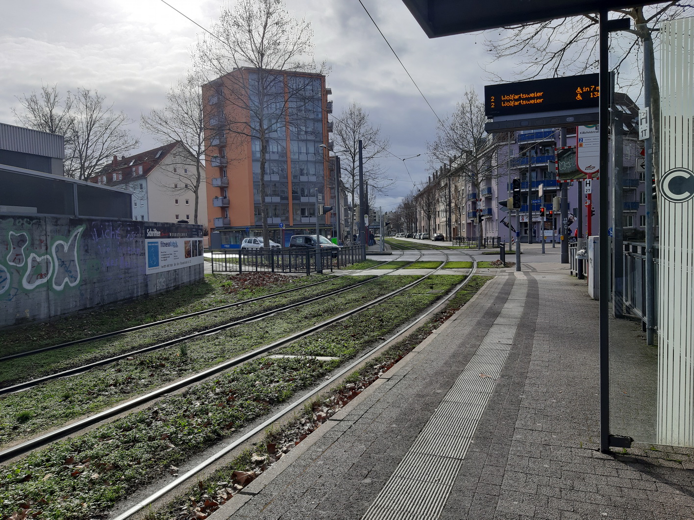 grobe Bebauung zwischen Bulach und Grünwinkel / Überquerung Tramstrecke nach Oberreut / Bahnhof Ka-West