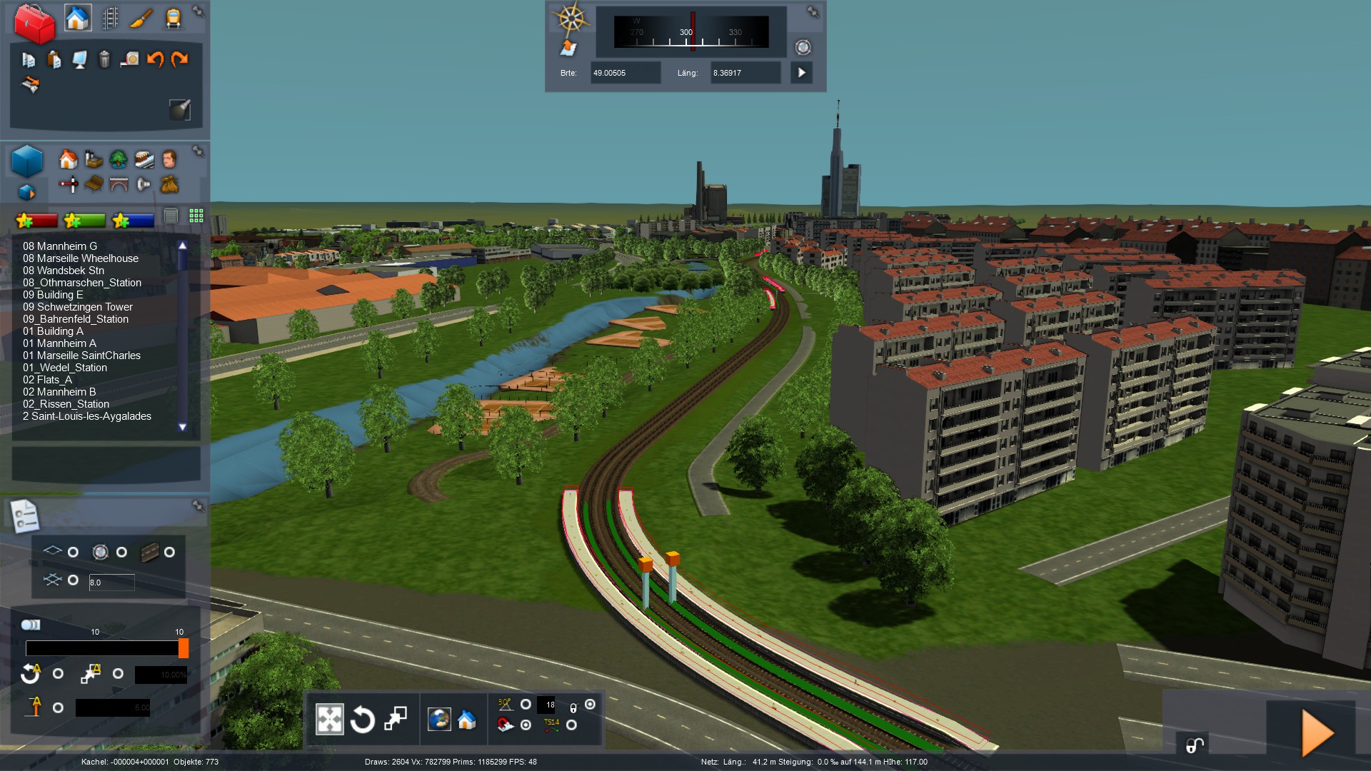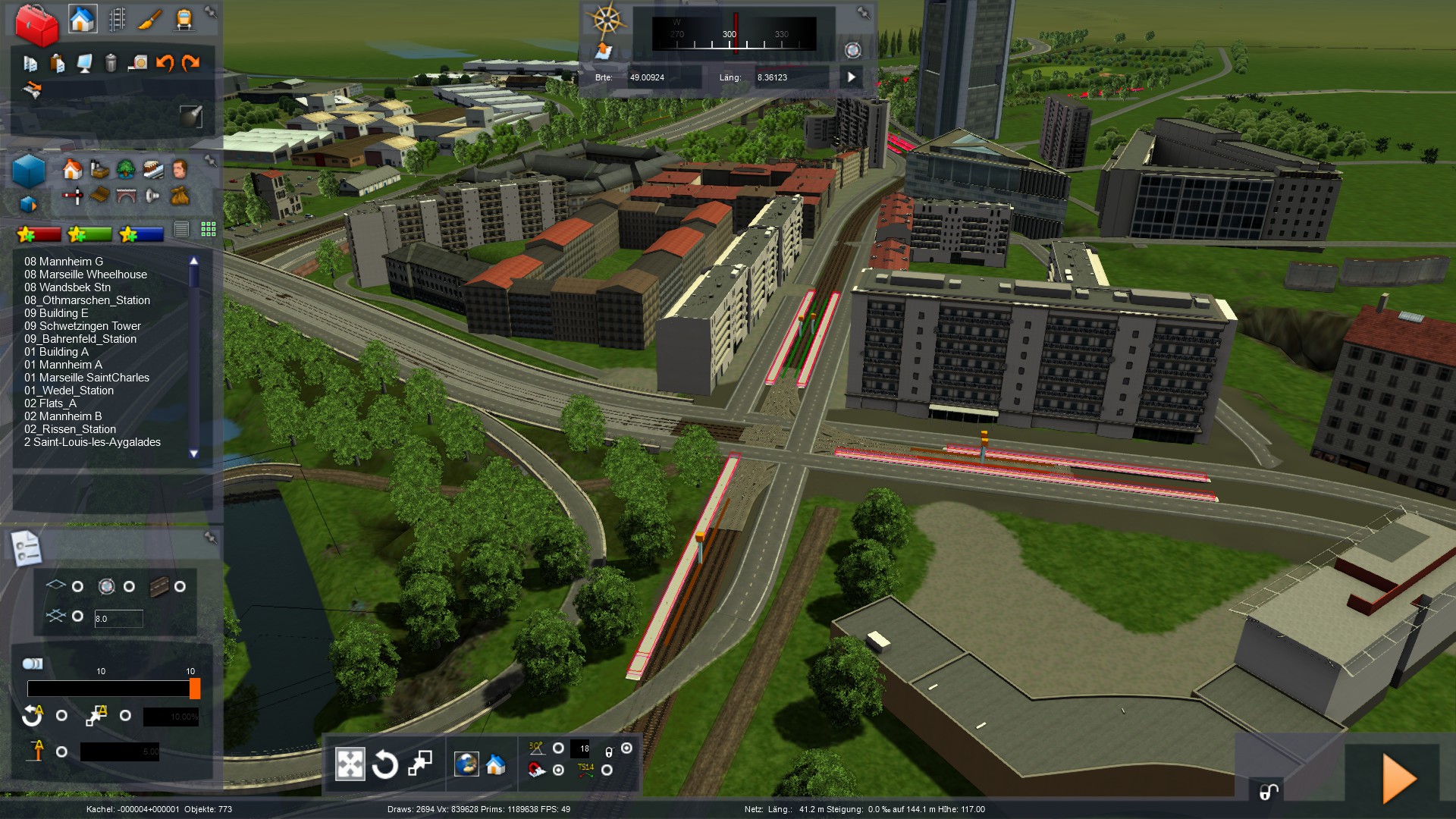 Ich hatte kürzlich beschlossen, die Umgestaltung des Bahnhofsvorplatzes (und auch den Südbereich des Bahnhofs), welche ich dort vorgenommen habe auf dieses Projekt zu übertragen, was das kopieren von Kacheldateien erforderte. Letztendlich hat es fast gut funktioniert. Einen Teil der geänderten Gebäudeverbauuung musste ich dennoch nochmal neu setzen, da eine Kachelgrenze ungünstig verlief. Eine Nachbarkachel hinzu zuziehen war ausgeschlossen, da es Einfluss auf einen bereits von mir bebauten Bereich gehabt hätte.