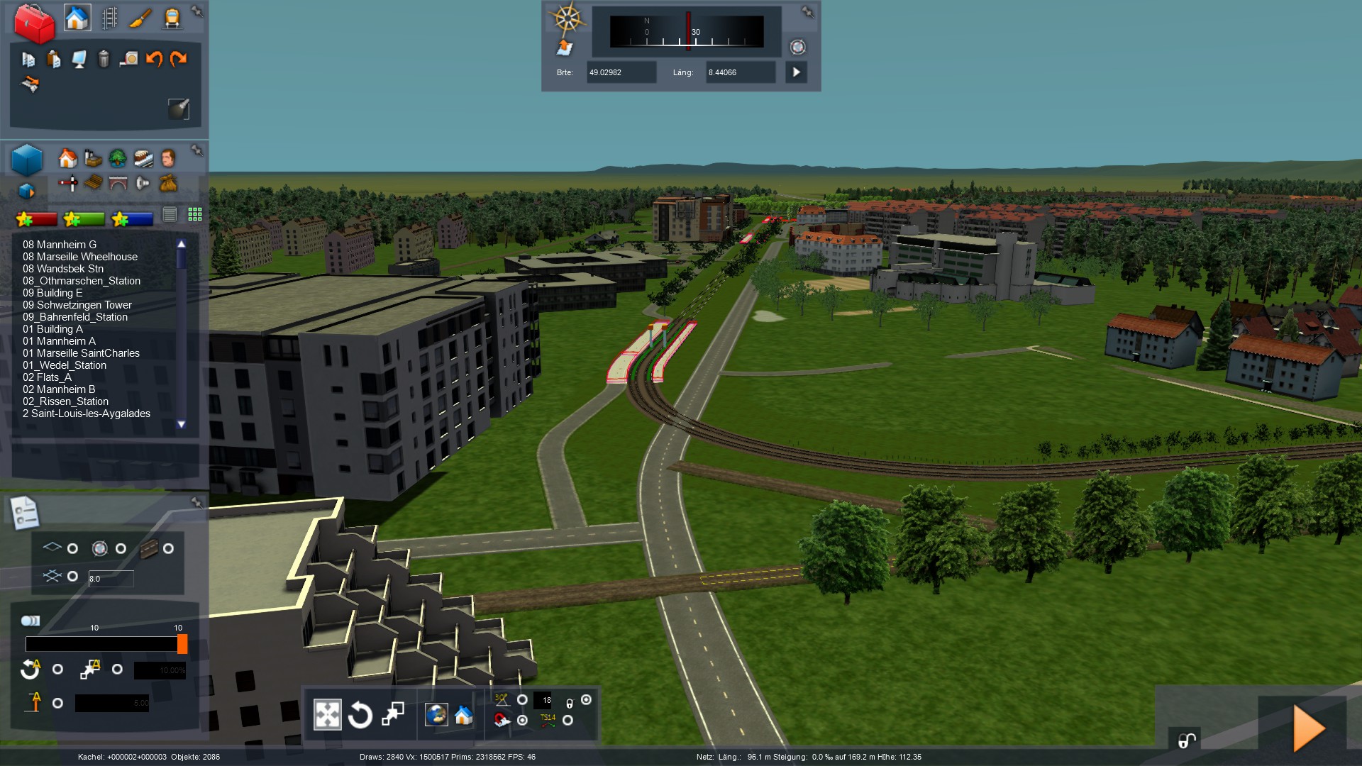 Gleise liegen, steigungsoptimiert und übergangsgeglättet, Haltestellen sind soweit platziert, nun gehts an Bebauung & Co. [alles nicht final]