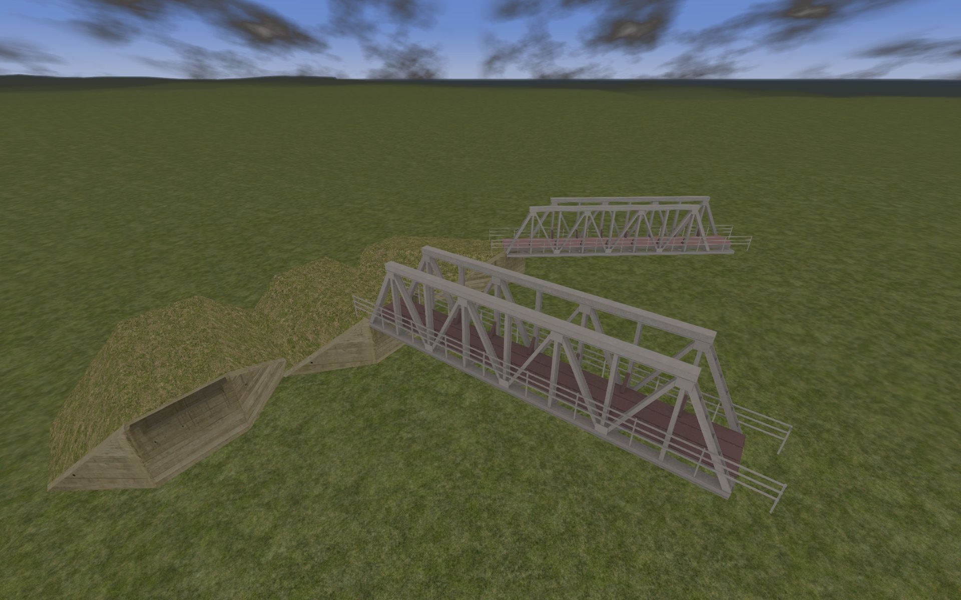 Im Bereich Lalendorf-Neustrelitz sind 2006 noch viele alte Straßenbrücken für Feldwege und co vorhanden. Diese erstelle ich momentan modular als Paket inklusive Seitenböschungen. Vorbild sind dabei die Brücken aus Hamburg-Hannover, die nach einem ähnlichen Prinzip arbeiten. Einblicke in die Erstellung gab es ja schon im Screenshotthread, aber das kann ich hier ja auch nochmal zeigen. Die Oberleitung liegt übrigens mittlerweile auch auf dem Abschnitt Neustrelitz-Waren! Lediglich die Speiseleitung habe ich mir für die Detailarbeit aufgehoben.