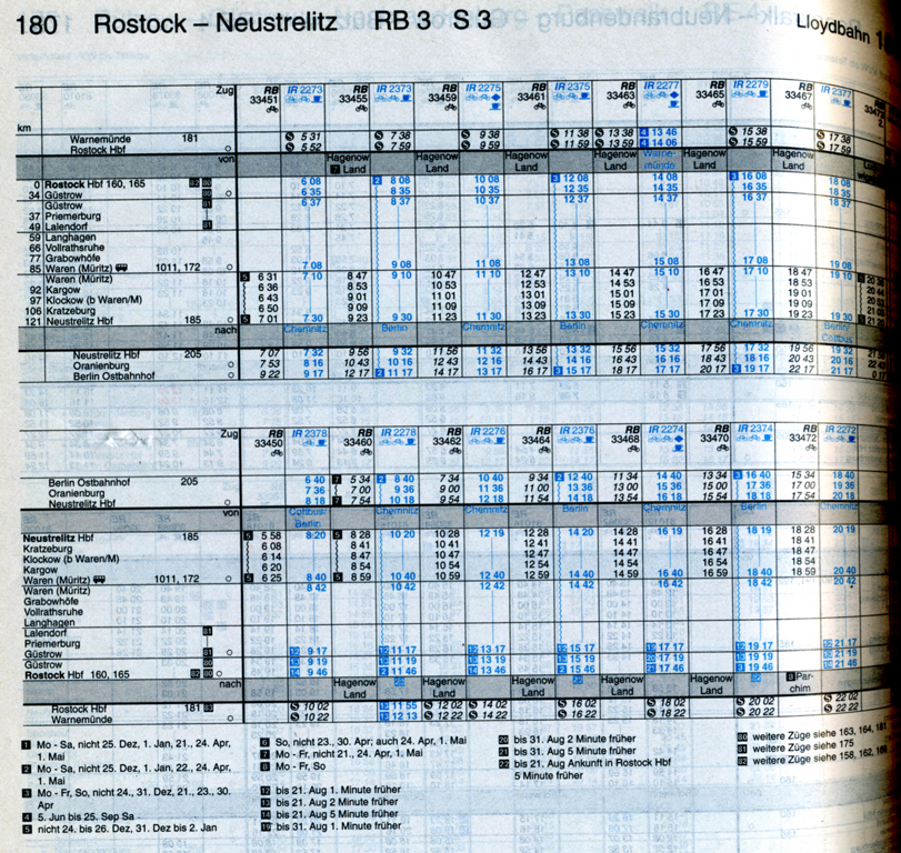 und dazu Waren - Lalendorf - Rostock: http://www.bahn1989.berlin/Downloads/808-16.pdfIn meinem Kursbuch von 1999 ist die Strecke auch zweigeteilt: KBS 205 Berlin - Neustrelitz - Waren (und weiter nach Stralsund) und KBS 180 (Neustrelitz) - Waren - Lalendorf - Rostock