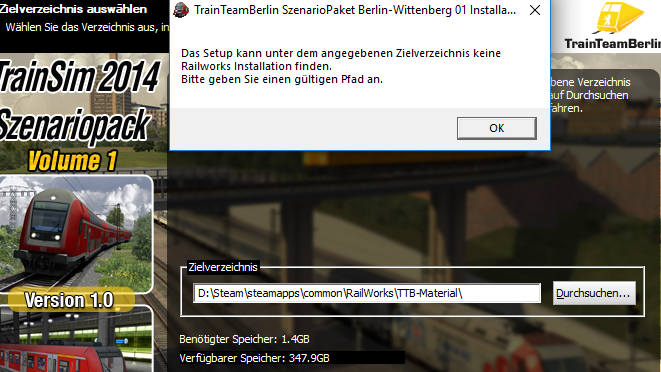 Ich habe TS auf einer seperaten SSD (D), dort kommt der Fehler und ich habe es Spaßeshalber auf der normalen (C) versucht, aber dort kommt genau der selbe Fehler. Ich habe vorher schon von TTB einige Bonuspacks installiert auf (D:)/steam/steamapps/common/railworks ganz normal und das hat geklappt, nur das Szenario Paket nicht. Kann es daran liegen das ich Berlin-Wittenberg nicht installiert habe ? Ich denke die Strecke braucht man nur für die Szenarios.