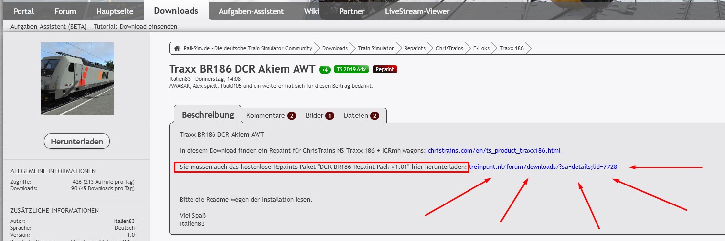 https://www.treinpunt.nl/forum…oads/?sa=details;lid=7728Ich habe bei google DCR BR 186 Repaint Pack eingegeben! Der erste Treffer ist es direkt!