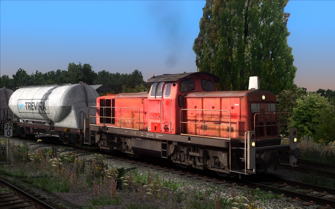 Hier zieht die Baureihe 294, 19 Schottergüterwagen, die sie zuvor im Basaltwerk abgeholt hat. ![]()