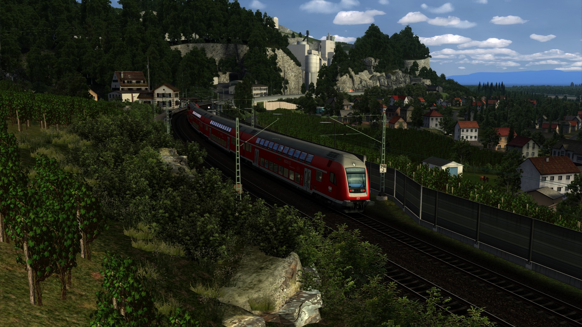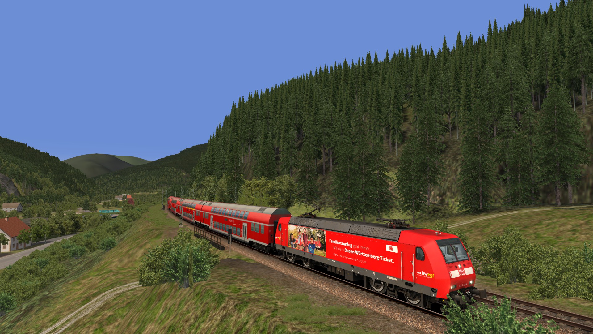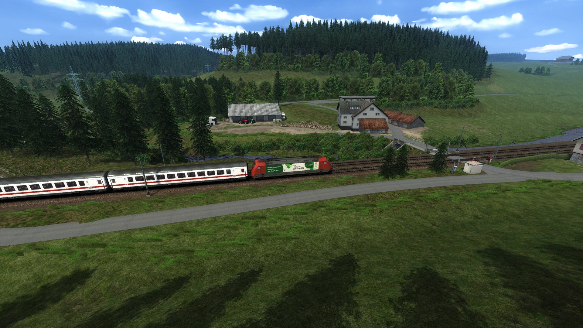 Eine Eisenbahn ohne großes Interesse. Nicht hässlich, aber auch nicht schön. Die hellen Farben der neuen Bäume stimmen nicht mit den alten verblassten Texturen überein. Das Material ist einfach gut für KI-Züge. Mit der vR-Spur und einigen Modifikationen kann es optisch ansprechend werden. Aber der Kurs wird langweilig bleiben. Es gibt nur wenige Variationen der Geschwindigkeit und nicht viele Steigungen. -