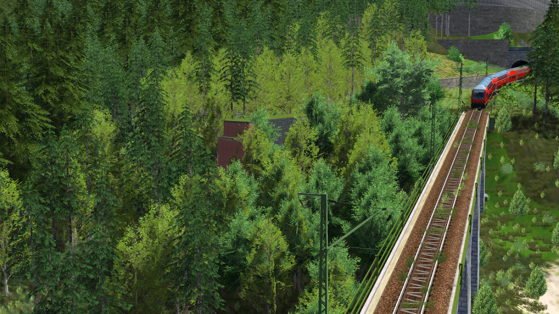 Schöne Bilder wieder, gute Bepflanzung, wie etwa der Mischwand bei der Draufsicht aufs Viadukt, allerdings raus mit dem hohen Kraut aus dem Gleisbett, bzw. massiv absenken. Ja die Soldaten (Bild mit Stellwerk) … selbst die besten Bäume sehen aus dem Abstand zu einheitlich aus. Entweder man mischt zwei Baumarten im Asset Block, skaliert dort tüchtig (+-0,8) oder mein kaschiert den Waldrand eben mit 2,3 Gruppen.