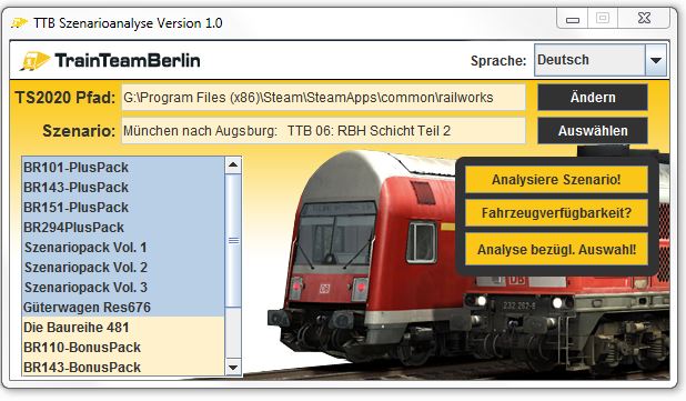 • Analyse eines Szenarios bezüglich einer Addon-Auswahl: im Hauptfenster kann eine beliebige Addon-Kombination vorgewählt werden. Die Analyse-Funktion prüft, ob das ausgewählte Szenario spielbar wäre, wenn diese Addon-Kombination auf dem PC installiert wäre. Mit dieser Funktion können bspw. Szenario-Ersteller mit wenigen Klicks prüfen, welche Angaben sie zu benötigten TTB-Addons in ihrer ReadMe-Datei bei einer Veröffentlichung machen können. Der Report enthält auch hier neben grundlegenden Angaben eine Consist-/Fahrzeugliste des Szenarios (TTB-Fahrzeuge je nach Installationsstatus in rot/grün markiert) sowie je eine Fahrzeugliste der (nicht) installierten TTB-Fahrzeuge, aus denen hervorgeht, in welchen Addons das jeweilige Fahrzeug enthalten ist.