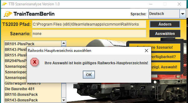 das Problem vom TRAXX-Driver haben wir per PN klären können: Railworks war im Default-Pfad, der beim ersten Start des Programms voreingestellt ist, installiert. Jedoch die Installation händisch so angepasst, dass es kein "gültiges" Verzeichnis mehr aus Sicht des Tool war. Das führte dann natürlich dazu, dass der (scheinbar) richtige Pfad vorgegeben war, die nochmalig durchgeführte Prüfung beim Versuch, ein Szenario zu selektieren, dann zur oben gezeigten Fehlermeldung geführt hat. Das Wiederherstellen aller abgefragten Dateien/Ordner hat dann zum Erfolg geführt. Bevor jemand fragt: es werden im Hauptordner die Railworks.exe, Railworks64.exe und die serz.exe kontrolliert. ;)