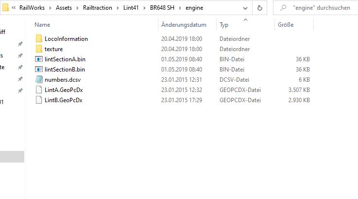 Im Ordner BR 648_nah_sh\engine sind die Ordner LocoInformation und Texture und die Dateien lintSectionA.bin, lintSectionB.bin und numbers.dscv. -