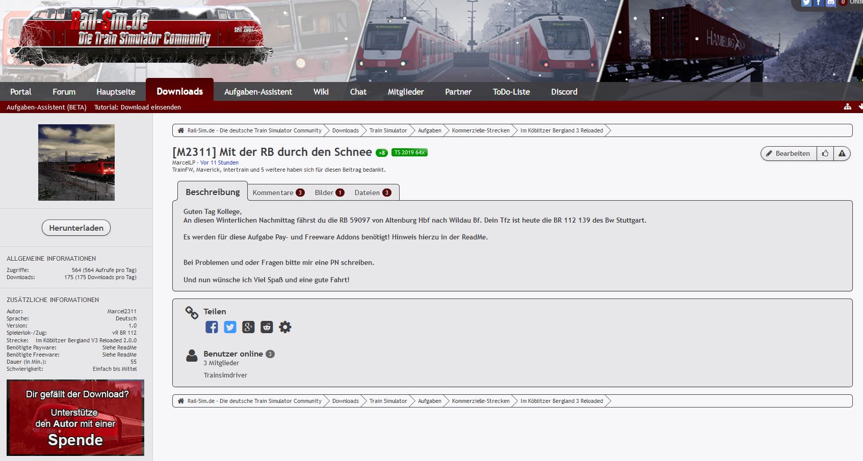 Wir möchten an dieser Stelle an alle Mitglieder unserer Community appellieren und euch bitten, wenn ihr die Möglichkeit habt und euch ein Download gefällt, den Autor mit einem Betrag eurer Wahl zu unterstützen. Ihr solltet alle nicht vergessen, dass der Train Simulator und Train Sim World nur durch die vielen Freeware-Entwickler so abwechslungsreich sein kann, wie er heute ist.
