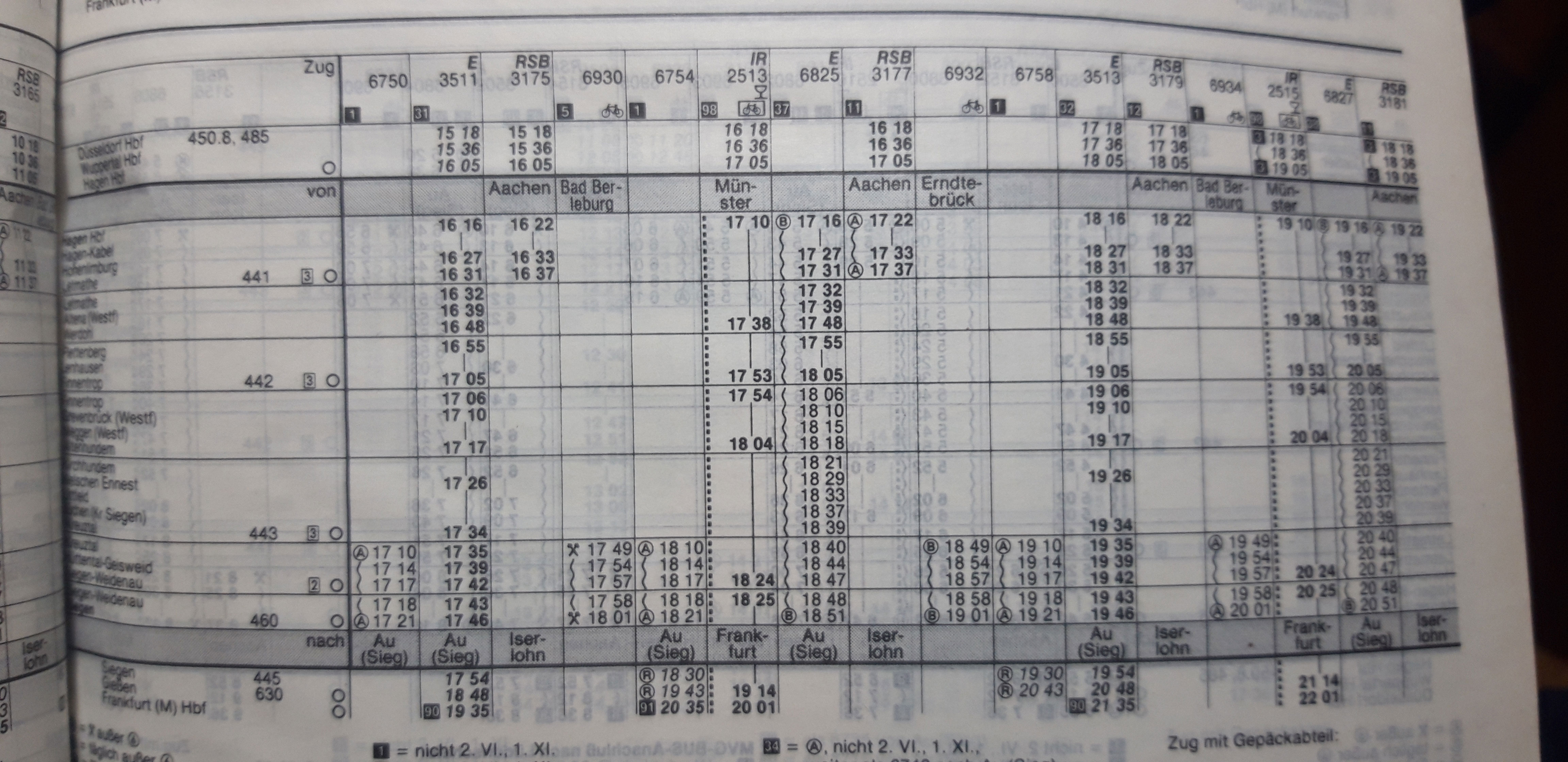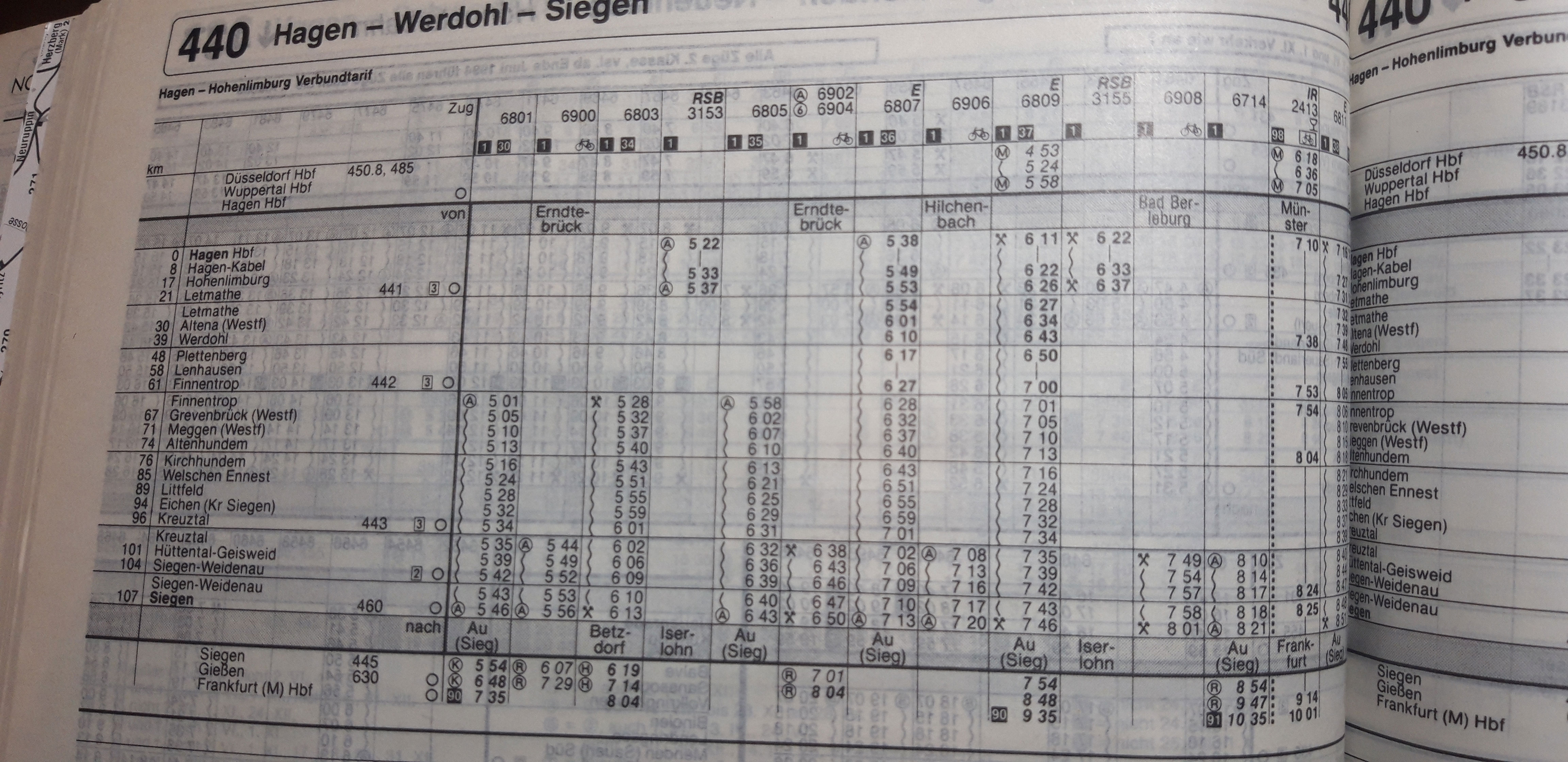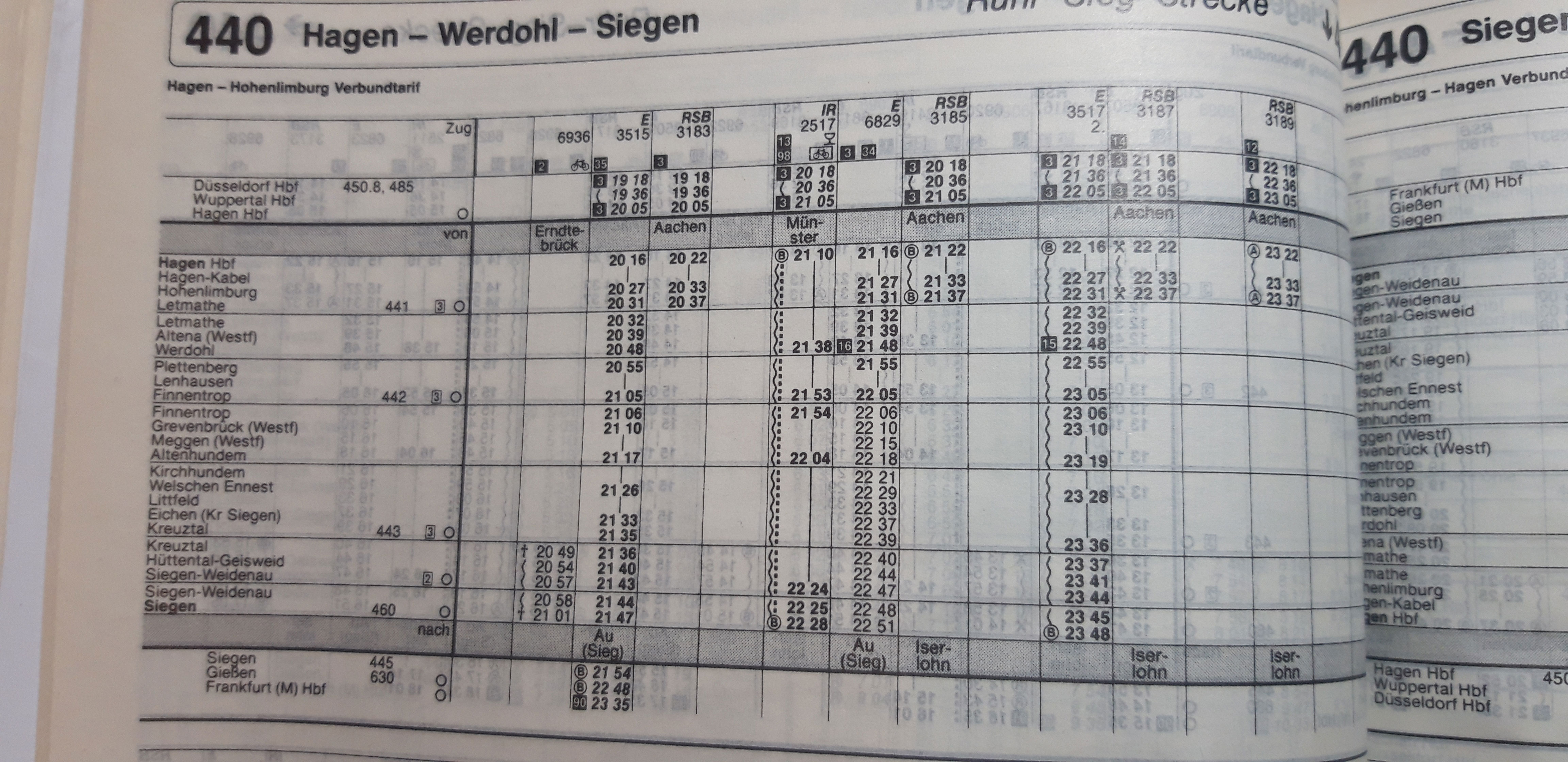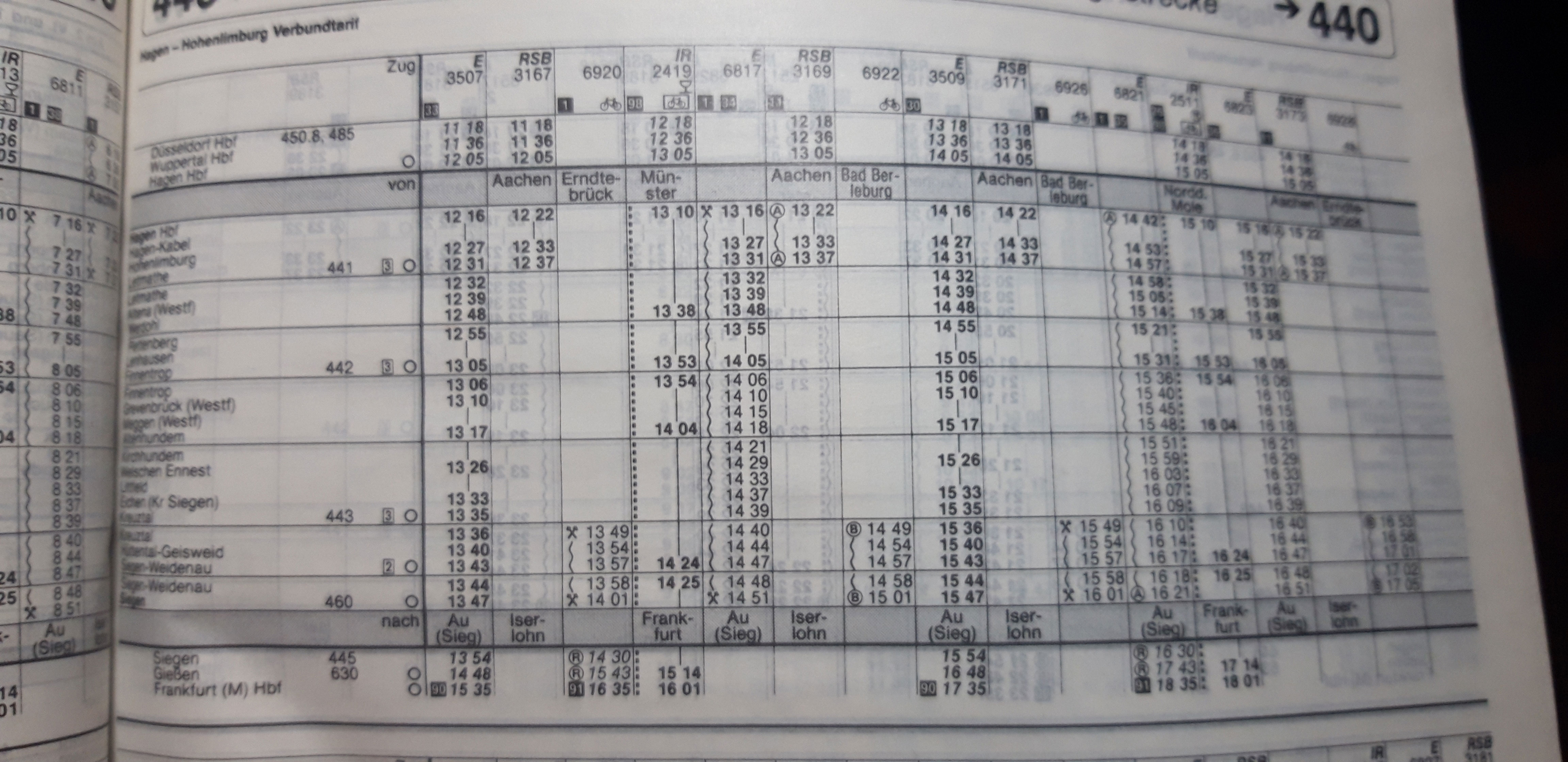 Guten Abend. Irgendwo hab ich neulich gelesen, das wer Fahrpläne der KBS 440 (Hagen-Siegen) von früher sucht. Finde den Beitrag leider nicht mehr. Ich hätte hier einen Auszug aus meinem Kursbuch 1994/1995. Sehr interessant der Zugverkehr. Was mich wundert das die InterRegios in Werdohl hielten. Dachte eher die hielten in Letmathe oder Altena. Und Hagen-Kabel ist auch noch verzeichnet. Allerdings ohne einen einzigen Zughalt.