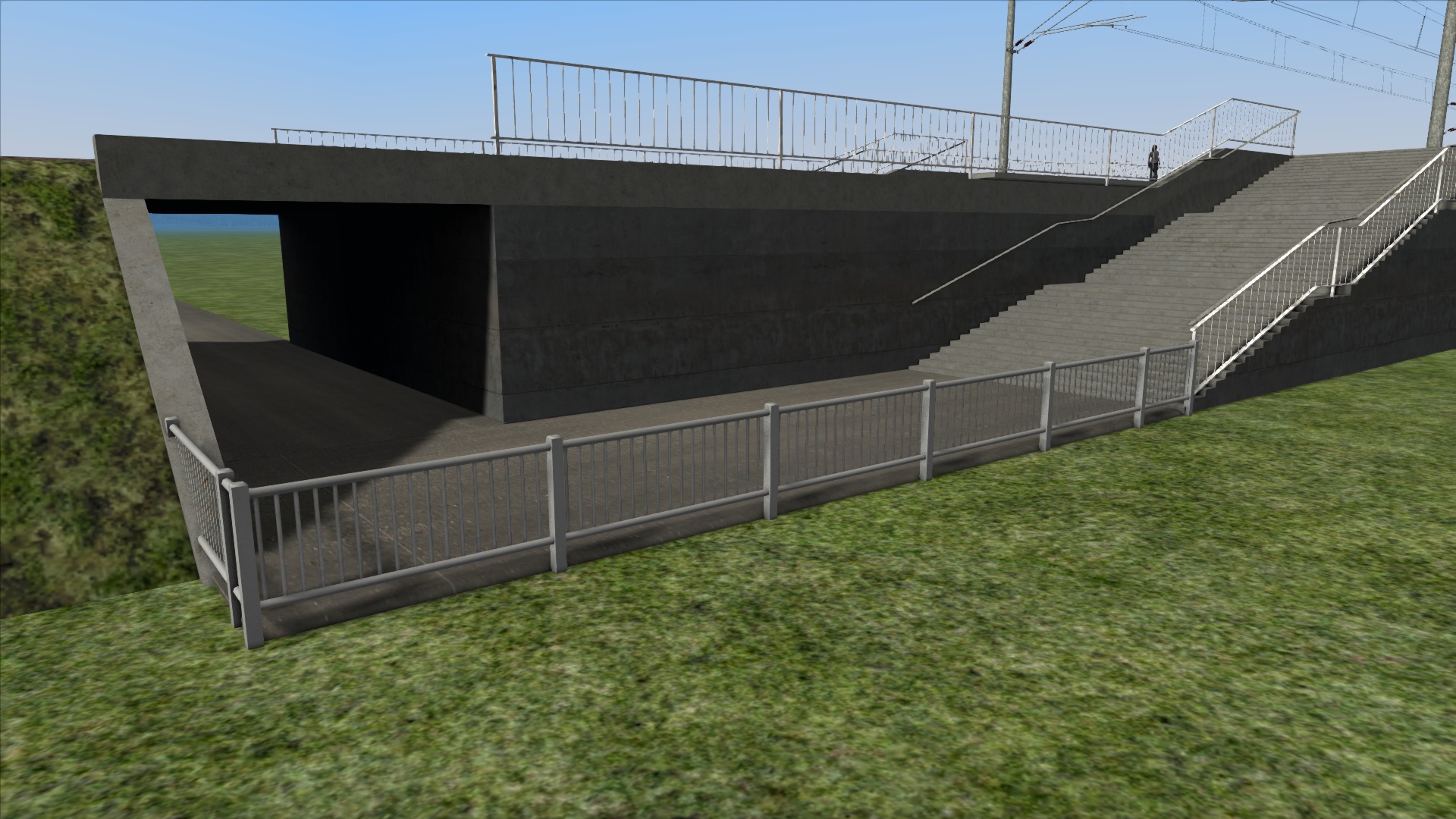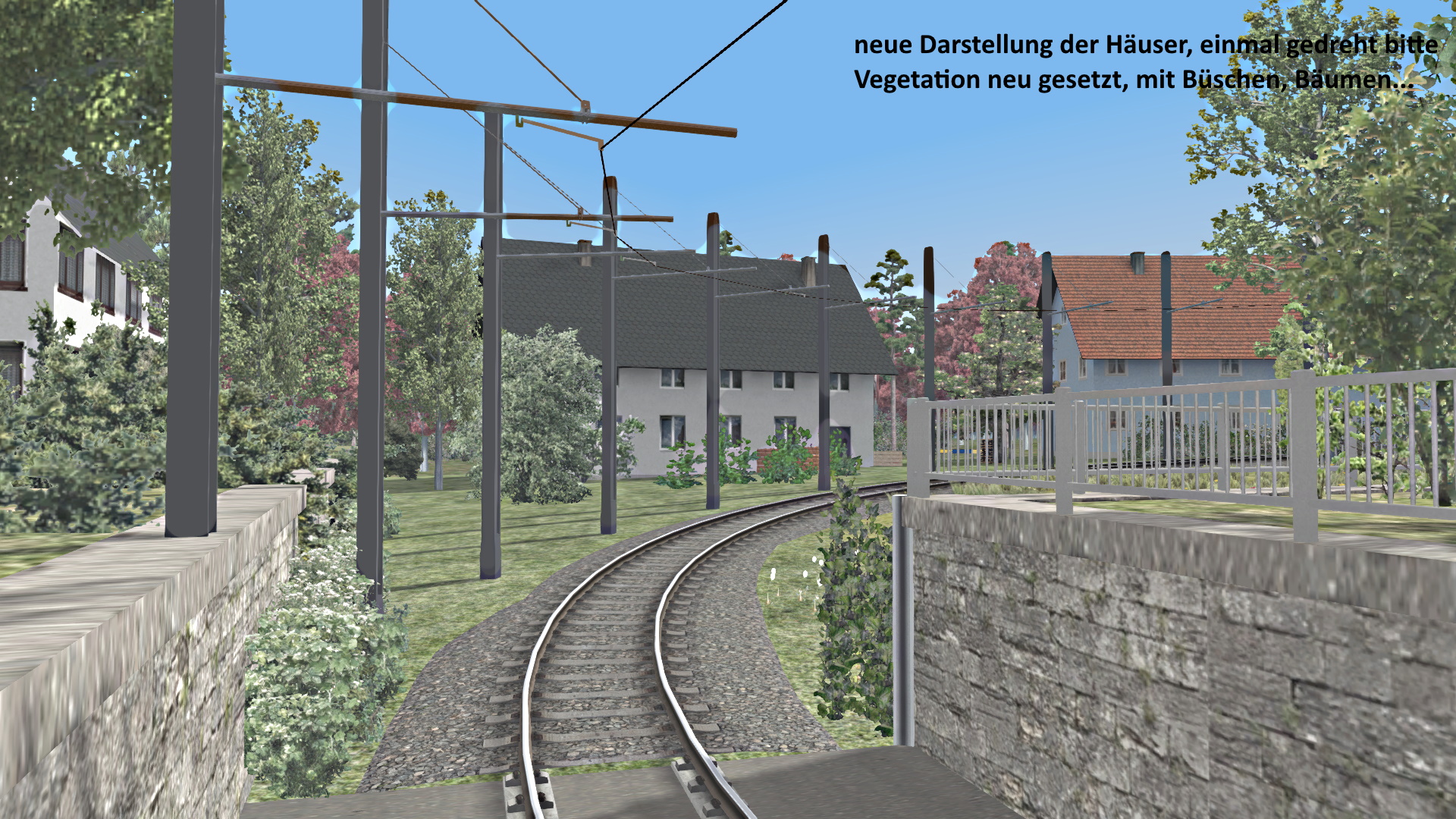 Die Fahrleitung wird auch aufgehängt. Nicht mehr diesen billigen Draht, sondern allesamt verbunden. Bei der Unterführung verläuft der Draht sanft tiefer, sodass der Stromabnehmer (theoretisch) sich senkt.