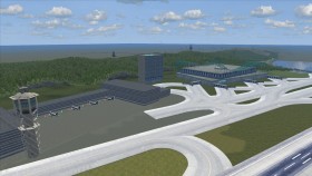 Die 4 Türme (2 sichtbar) zeigen den Platz des Bahnhofs an, später werden Texturengleiche Platten verlegt damit die Piste und der Bahnhof erkundbar ist. Schliesslich docken die Flugzeuge sozusagen ans Gate an und verlassen es wieder - wie an einem echten Flughafen.