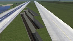 Die 4 Türme (2 sichtbar) zeigen den Platz des Bahnhofs an, später werden Texturengleiche Platten verlegt damit die Piste und der Bahnhof erkundbar ist. Schliesslich docken die Flugzeuge sozusagen ans Gate an und verlassen es wieder - wie an einem echten Flughafen.