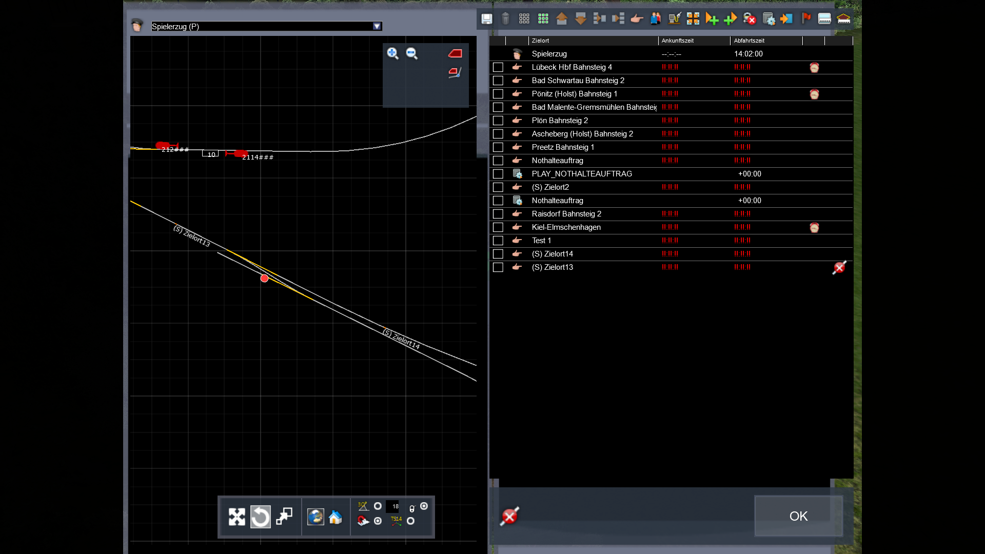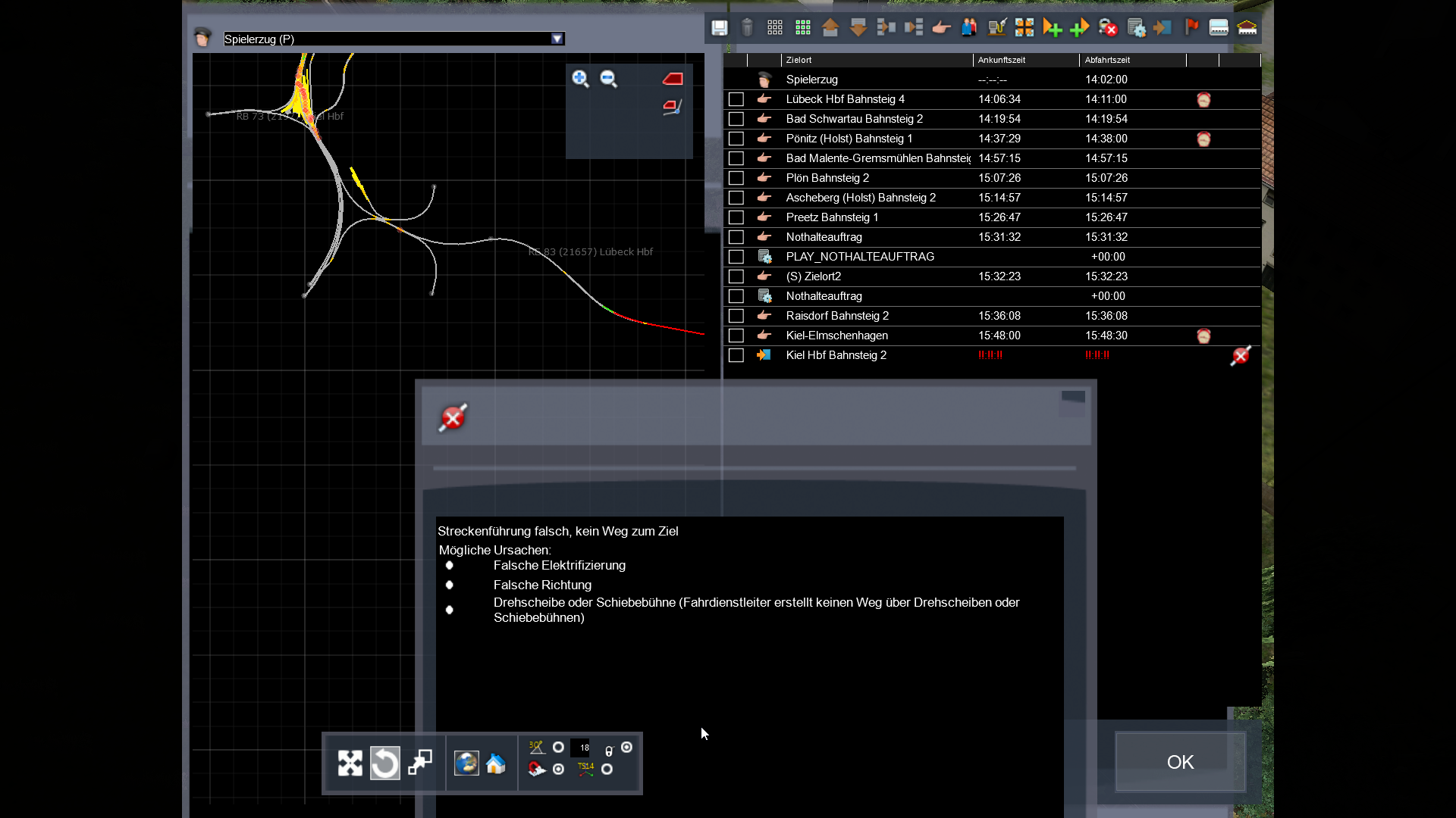 Es geht mit einer BR 204 als kleinen Sonder-Güterzug von Lübeck nach Kiel (Deluxe Version der Strecke). Bis kurz vor dem Ziel funktioniert alles (Zugkreuzungen und ein Nothalteauftrag) ohne Probleme. Nun kommt es in Kiel Elmenshagen zu der letzten Kreuzung mit dem RE 83 (21627). Soweit ich das beurteilen kann, klappt diese Überholung auch, möchte ich nun aber weiter im Dispatcher den Zug in den Hauptbahnhof fahren lassen, kommt die Meldung "Streckenführung falsch, kein Weg zum Ziel". Dabei ist es komplett egal auf welches Gleis der Zug soll, der Fehler taucht jedes Mal aufs Neue auf. (Auch wenn ich den RE 83 komplett entferne). Geplant war es dann geschoben über die Nebengleise in den Hafen zu kommen, weil ja leider keine direkte Verbindung von der Strecke dahin existiert. Aber auch wenn ich als Endstation den Hbf auswähle, funktioniert es nicht.