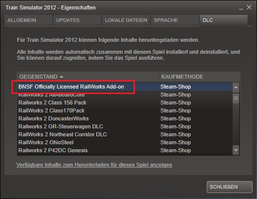 Aufzurufen durch: Rechtsklick in der Steam Spiele Liste auf Trainsim 2012 -> Eigenschaften -> oben der Tab DLC