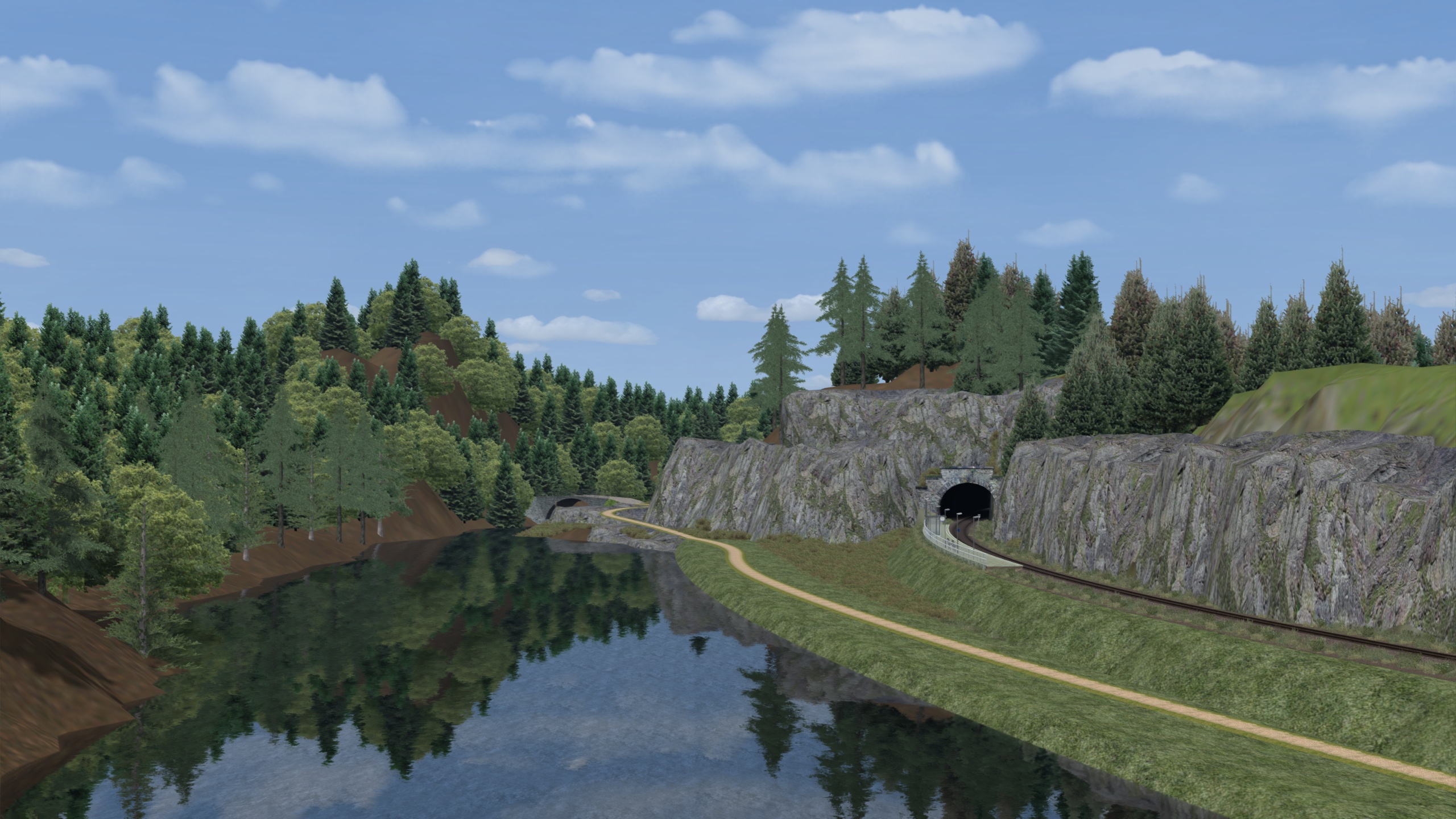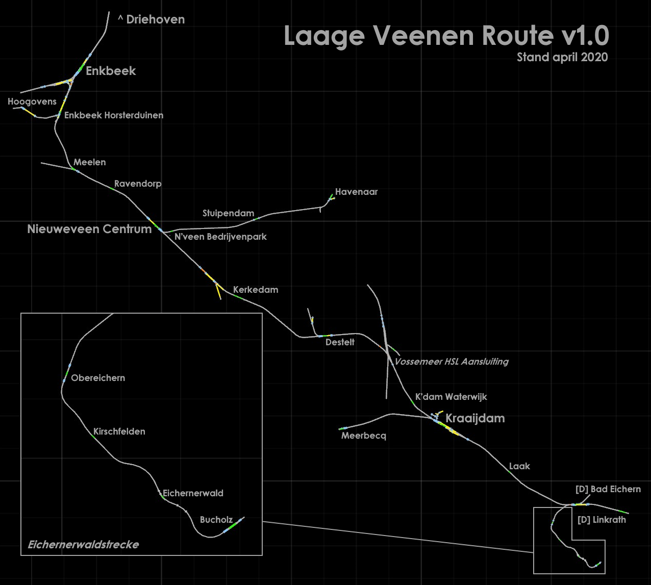 After opening a topic on DutchSims I thought it would be appropriate to open a topic on this forum too. The "Laage Veenen Route" - Low Turf Route - runs from Enkbeek to Kraaijdam. From Kraaijdam the line continues to Bad Eichern in Germany. The total length of this stretch is about 55 km. The overal route length is almost 70 km, so there's plenty to see and do. In the first version a small section of the Eichernerwaldstrecke is included, a "Nebenbahn" from Bad Eichern to Bucholz (and further to Merschfeld in upcoming releases). Plans can change, so all this can be different in the release. ![]()