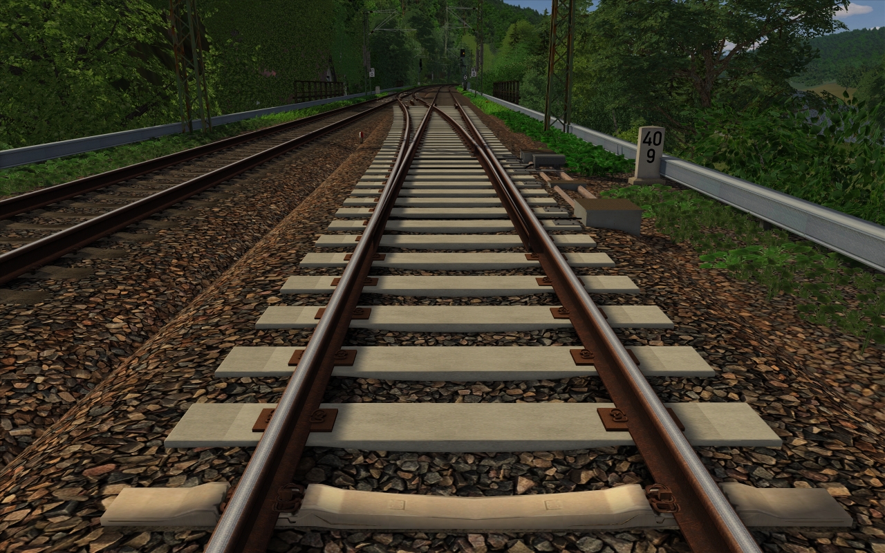 Dank neuem Gleistyp "ohne Schwellen" kann nun der Weichenbereich beliebig gestaltet werden, so wie hier gemäß Vorbild mit versetzten Schwellen.