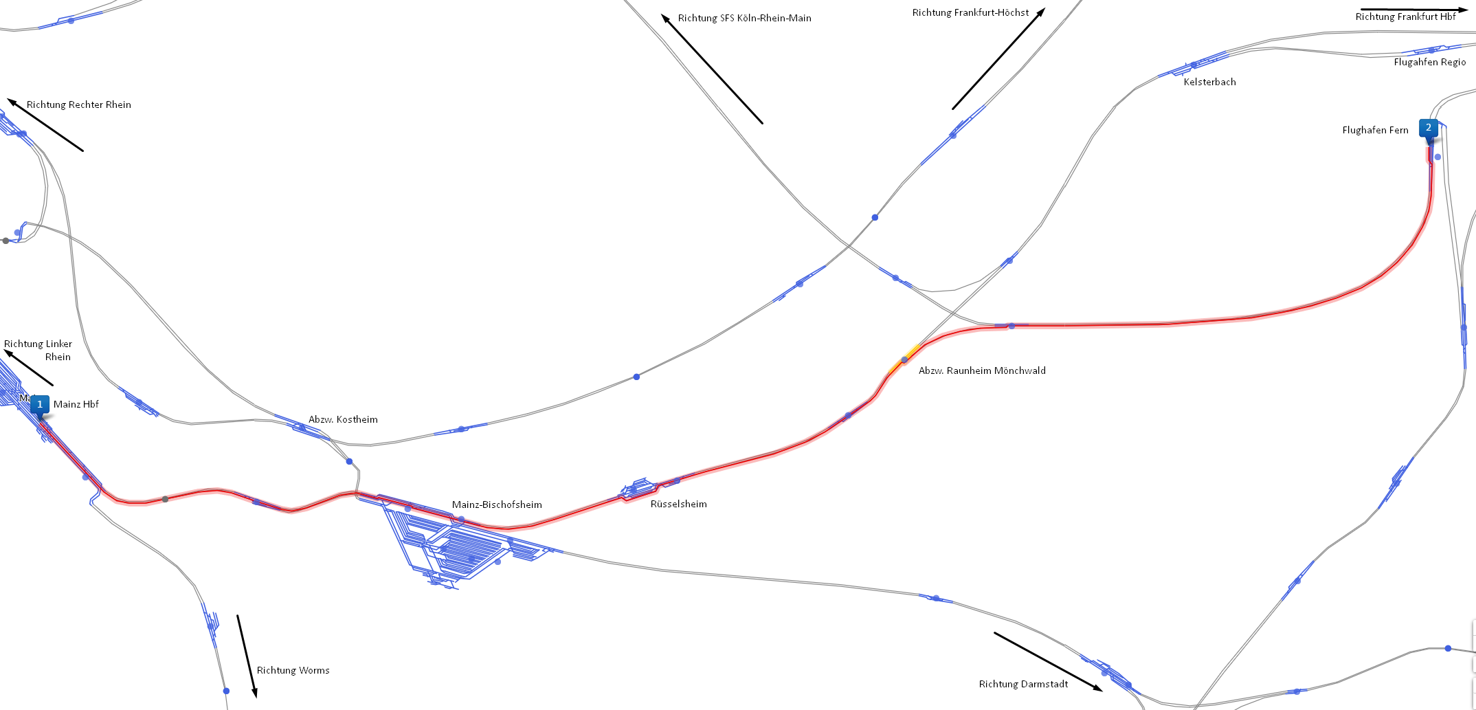 Mal gucken, welche Möglichkeiten man zwischen MZ-Mombach und Frankfurt(Main)Hbf hat. Die Güterstrecke über die Kaiserbrücke und Abzw. Kostheim sollte lieber dabei sein...
