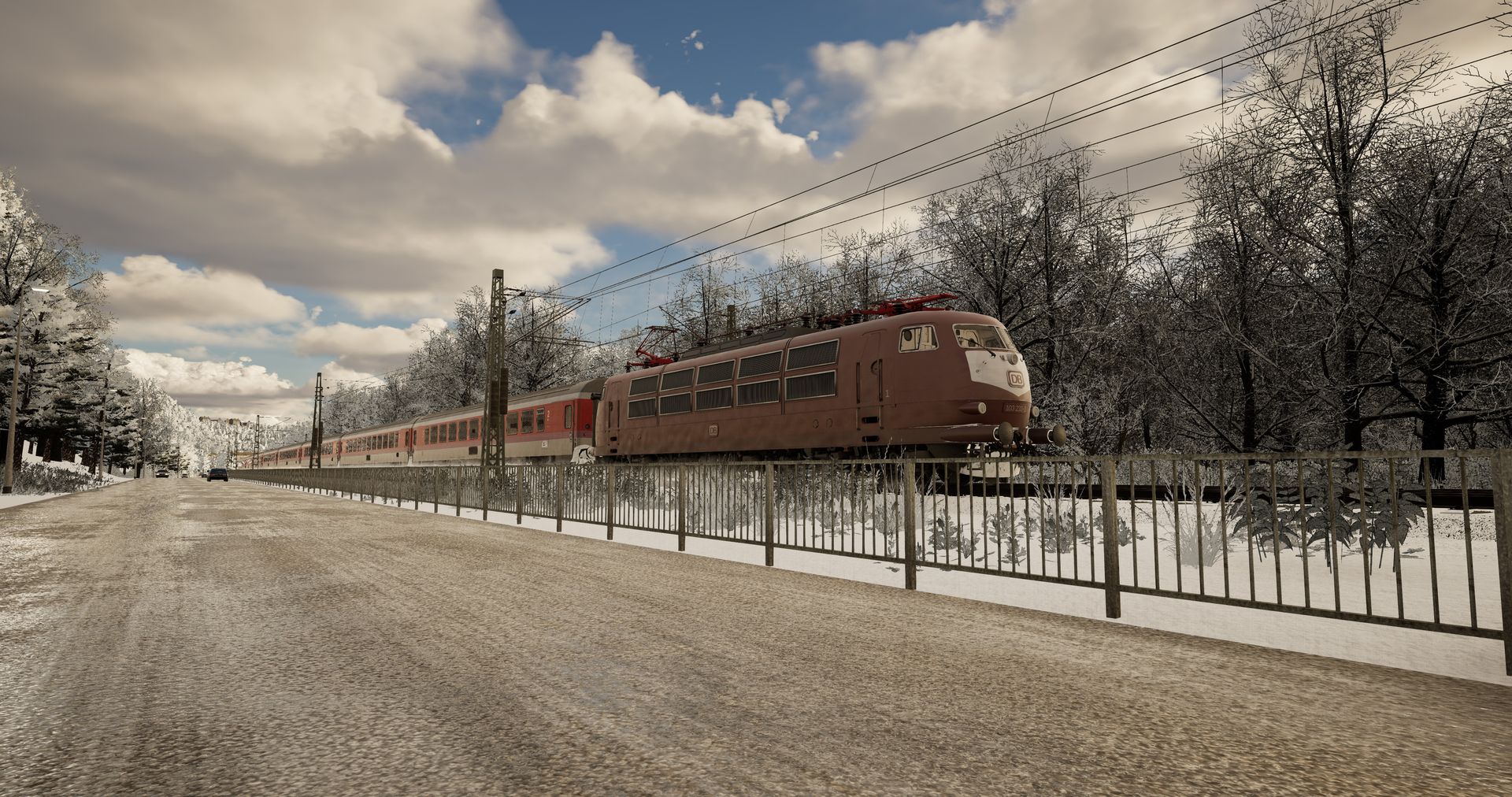 Im tiefsten Winter durchfährt der EC 29 Prinz Eugen mit der orientroten 103 und einem schönen ÖBB EC (WiP) am Haken das Rheintal.