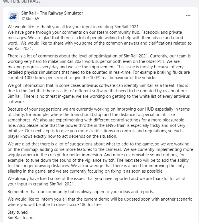 • Die Entwickler haben sich bedankt siehe Statements unten und angekündigt das die Demo Version um die Traxx E186, bei uns Br 186 erweitert werden soll. In den Kommentaren wurde dann noch bestätigt, das eine Konsolenversion geplant sei.