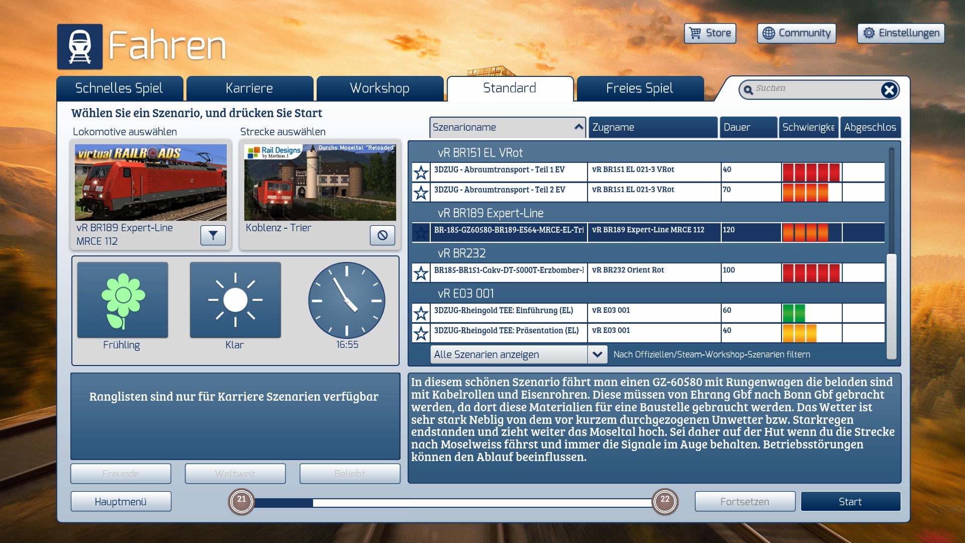 Zur Zeit befindet sich bei mir noch folgendes in der Entwicklungsphase: Spätsommer ICE-929 Teil 2 auf Frankfurt-Koblenz, GZ-45022 auf Freiburg-Basel Reloaded 2018, Personenzug-sowie Güterzugaufgaben für München-Garmisch-Deluxe (Name und Nummer habe ich noch nicht parat), und Aufgaben Güter-und Personenzug für Hamburg-Hannover-Deluxe (allerdings noch in der Planphase). Da ich halt immer etwas Zeit benötige kann ich das nur Scheibchenweise abarbeiten, aber ich hoffe das sie in Naher Zukunft das Licht der Welt erblicken werden.