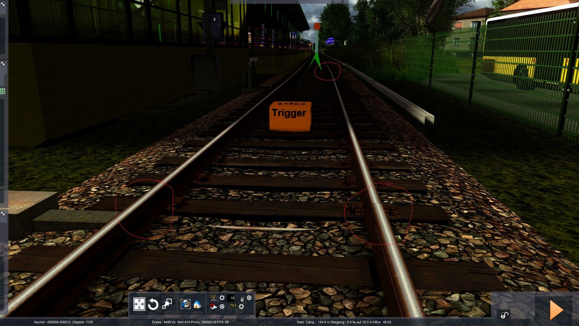 Bild 3: In Lichterfelde Süd ist mir ein Gleislagefehler (rot umrandet) aufgefallen. Einerseits die getrennten Schienen und auch der Knick im hinteren Bereich, das macht das Fahren etwas unangenehm.