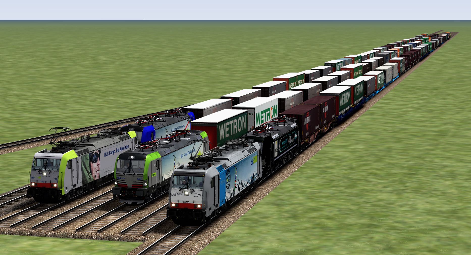 3 fotoreale Wetron/Jan de Rijk Kombi Züge (DGS 41074/75 Melzo-Krefeld Uerdingen-Melzo), also genau so sind sie in der Realität gefahren, warten auf ihre Einsätze auf den vorhandenen TS-Strecken... Köln-Koblenz, Koblenz-Frankfurt, Frankfurt-Karlsruhe, und Freiburg-Basel und auch am Gotthard...