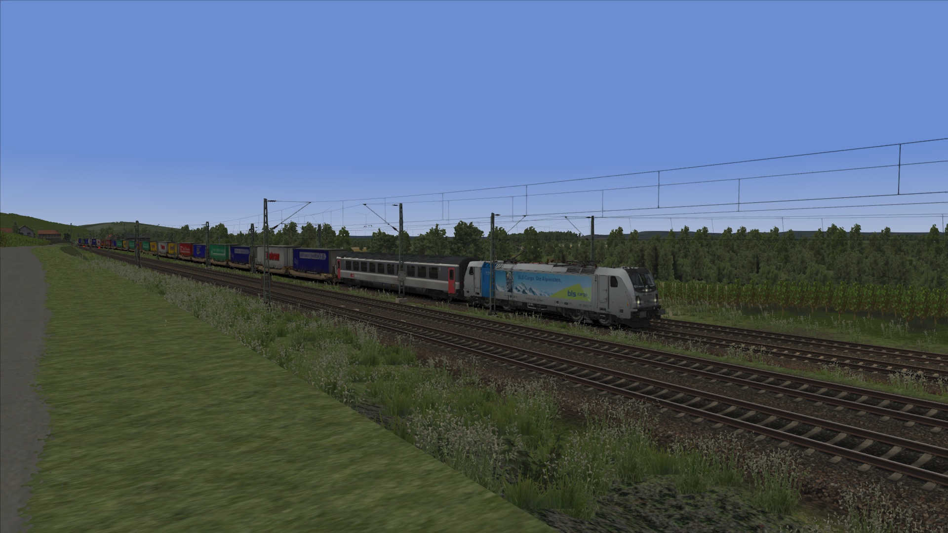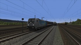 Heute hab ich die Traxx3 mal in ihrem "natürlichen Lebensraum" gefahren, als eine semi-reale ROLA der BLS AG. Semi-real deswegen, weil ich erstens den eigentlich eingesetzten BLS-Wagen nicht hab und zweitens weil mir außerdem der LKW-Wagen fehlt.