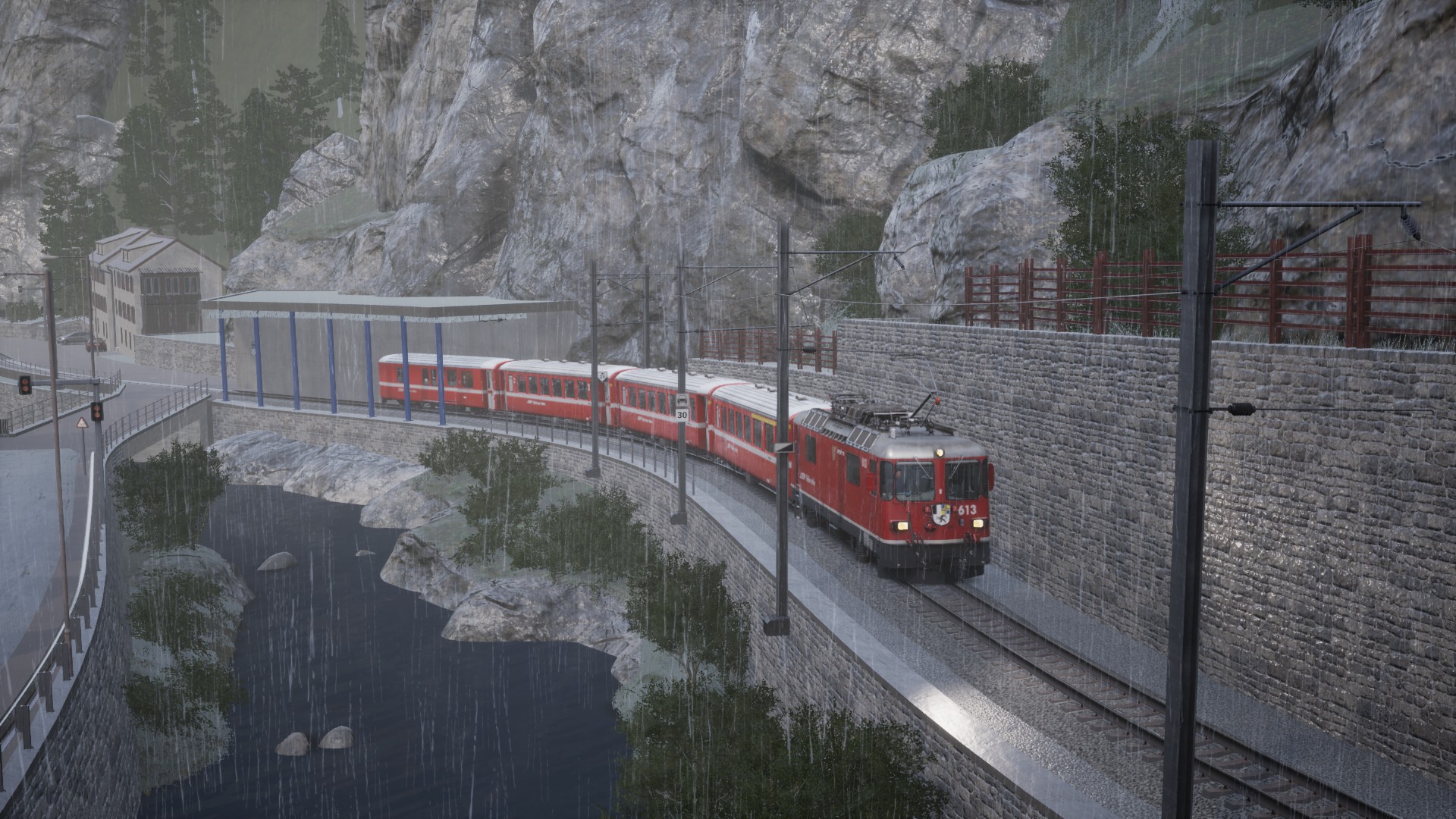 Interessant finde ich, dass offenbar nicht einfach das Wetter ändert, sondern auch die Texturen. Das macht Sinn, denn Chur liegt auf 593m und Arosa auf 1775m. Da kommt es oft vor, dass es unten regnet und oben tiefster Winter herrscht. Ich habe nicht gewusst, dass TSW2 das kann.
