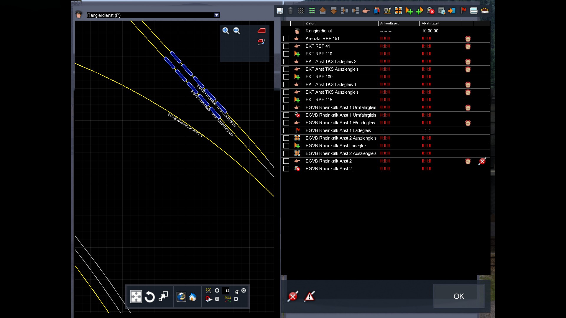 Bis zum Abstellen und Rangieren zum "Huttental-Geiswald Schrott Rangiergleis" geht alles. Nun will ich aber 3 verschiedene Gleise ansteuern, auf denen die beladenen Wagen abgestellt sind. Dazu nehme ich dann ab "Huttental-Geiswald Schrott Rangiergleis" das Symbol "Rangieren" und gebe dort auch die anzuhängenden Wagen an. Leider bekomme ich dann eine Meldung: