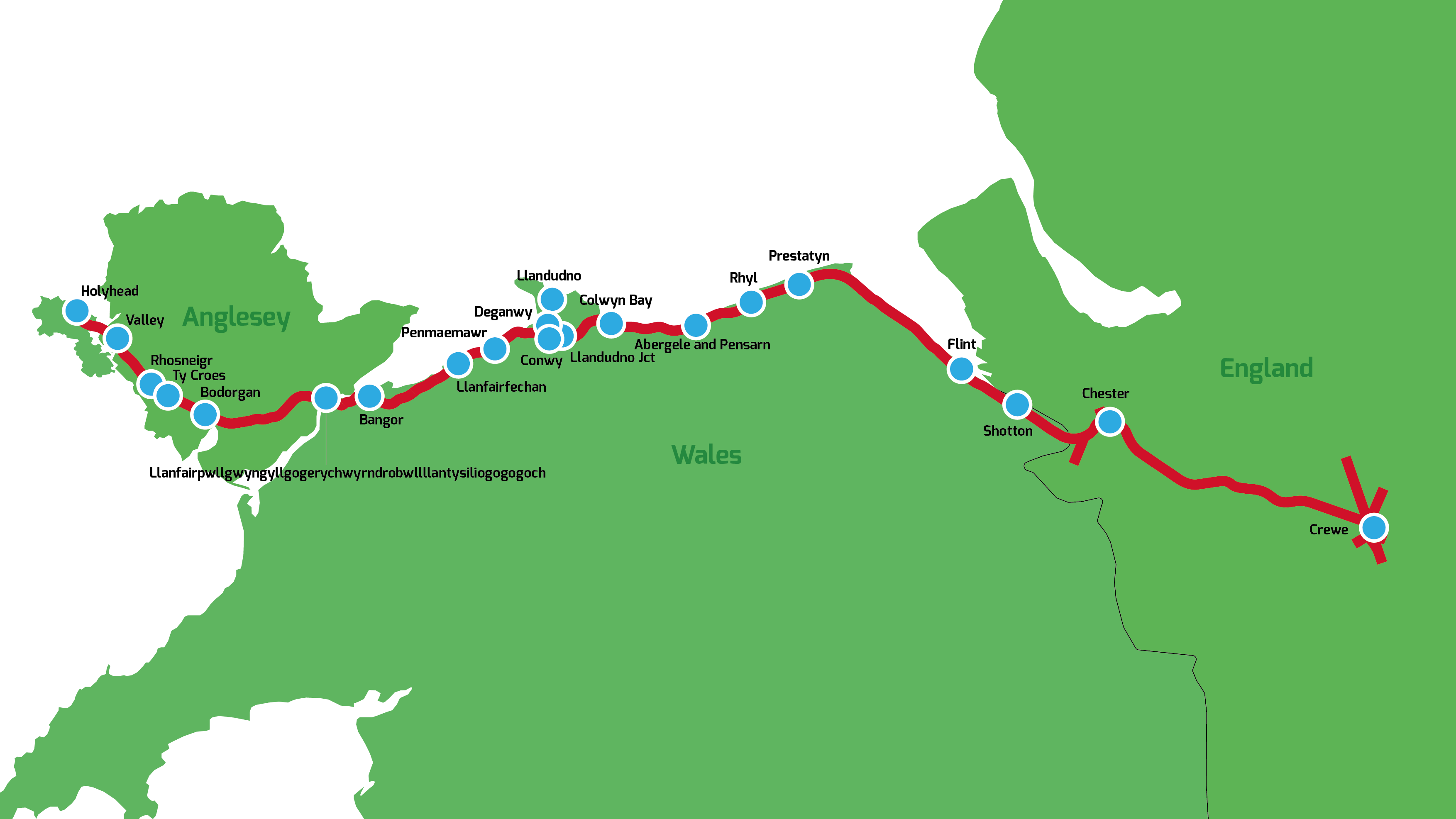 Die Strecke wurde kurz darauf fertiggestellt und war im August 1848 bereit, die Kommunikation über die Meere zu verändern. Die Irish Mail verkehrte regelmäßig von London nach Crewe, entlang der Strecke der West Coast Main Line, und weiter nach Holyhead und schließlich nach Irland. Zu diesem Zeitpunkt war die ursprüngliche Chester and Crewe Railway bereits in der Grand Junction Railway aufgegangen, und die Chester and Holyhead Railway folgte diesem Beispiel 1859, als sie Teil der London and North Western Railway (LNWR) wurde.