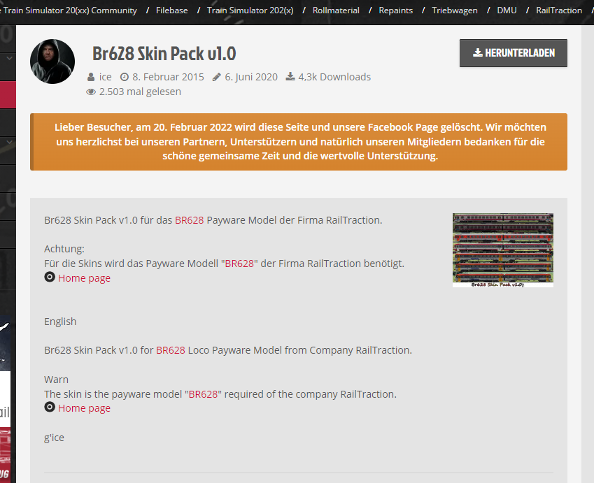 Seitdem Railsimulator.net Offline ist, finde ich keinen Weg mehr an das Reskinpack von ICE zu kommen für die BR628. Hat das zufällig noch jemand und könnte es teilen oder gibt es das sonst noch wo?