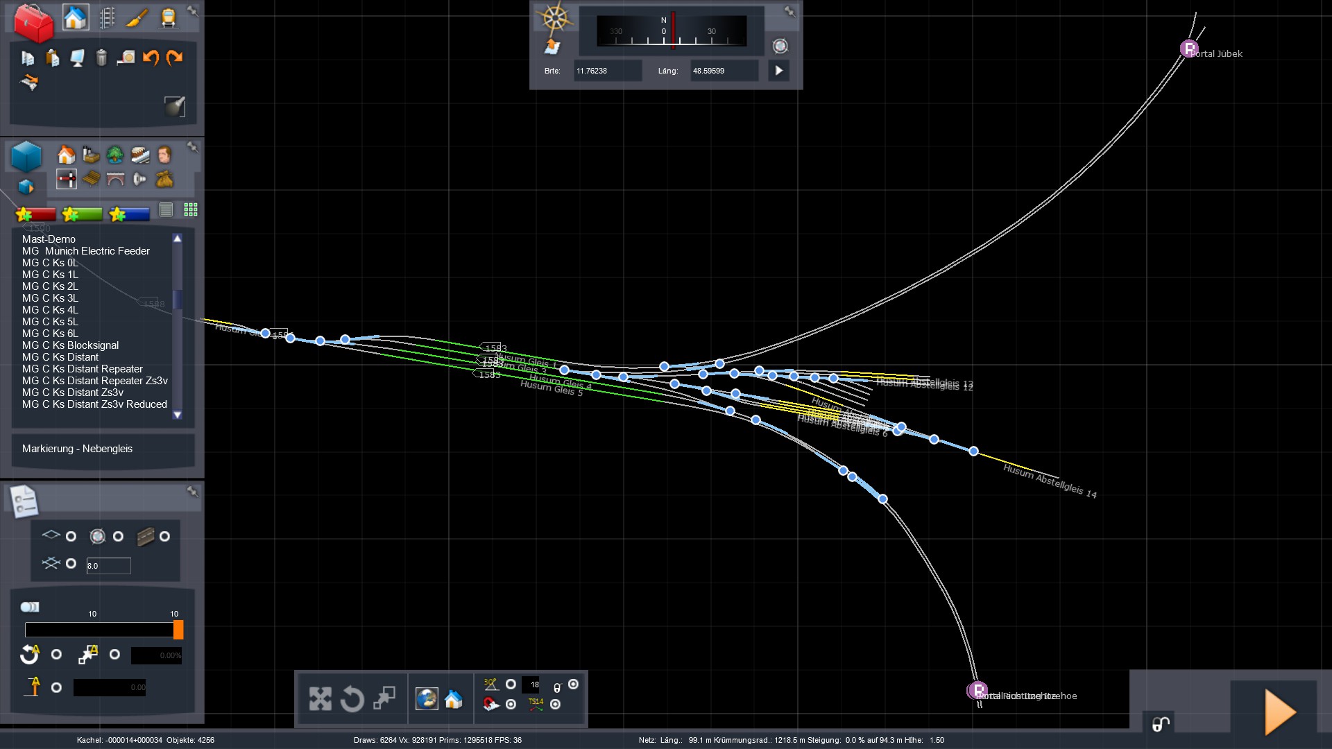 - Gleisumbau größten Teil vollständig. Mir fehlen Daten zum Husumer Bahnhof auf den Anschlüssen der ehemaligen NOB - daher ist die Ausgestaltung derzeit nur dürftig in Husum verbessert. Weichen sind aber neu gesetzt, und der Weg nach Jübek umgesetzt - bzw HV Kompakt Signale eingetauscht, da diese besser dahin passen.