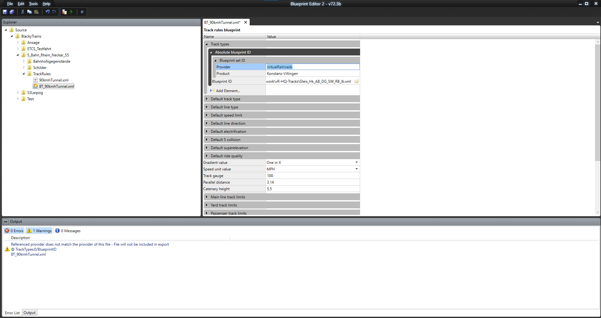 ich versuche eine TrackRule zu erstellen. Dabei wollte ich dem Wiki-Eintrag folgen, allerdings scheiterte ich schon am ersten Schritt, da der Blueprint Editor 2 anders aussieht als im Wiki gezeigt. Einen "Insert first" Button existiert bei mir einfach nicht. Deswegen habe ich versucht, eine neue TrackRule anhand einer bereits vorhanden zu erstellen, quasi auf "wird sich schon selbst erklären". Dabei habe ich mir eine TrackRule aus Konstanz-Villingen kopiert, mit serz in .xml umgewandelt und die darin enthaltenen Daten (Provider, Product und BluePrint-ID der Gleise) kopiert und in meine neue TrackRule in BPE 2 eingefügt. Nun meckert dieser aber, der Pfad zum Provider wäre falsch. Dabei ist das doch das, was da in der funktionierenden TrackRule steht, also sollte das doch stimmen?