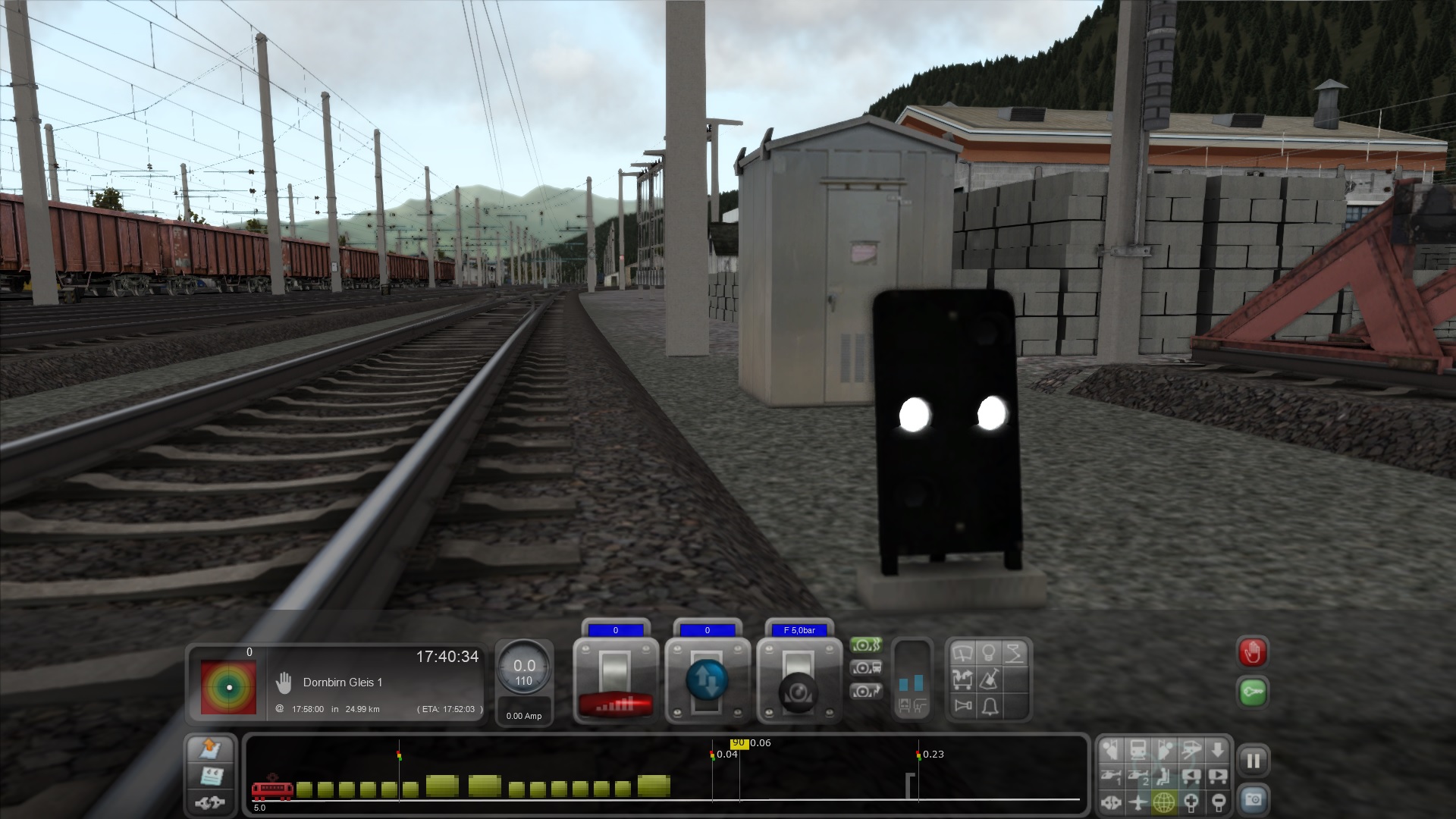 Kurz nach dem Start in Feldkirch steht neben dem Gleis ein kleines Signal mit zwei permanent leuchtenden, weißen Punkten. In Deutschland würde ich es wohl als Gleissperrsignal bezeichnen. Fahre ich drüber heißt es, dass ich unerlaubt ein haltzeigendes Signal überfahren habe, drücke ich TAB wird mir die Erlaubnis zum überfahren erteilt. Überfahre ich das Signal dann, wird das Spiel dennoch beendet.