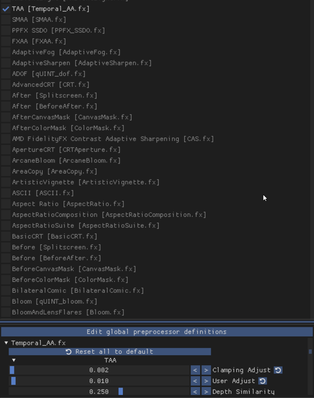 anbei 3 screenshots, wo du die Einstellung des TAA Filters siehst bei mir, um so gut wie keine ghosting Effekte zu haben , die sonst auftreten würden.
