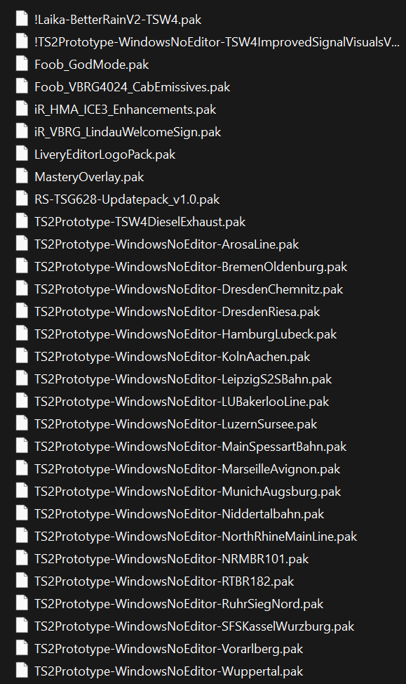 Setidem ich TSW 4 habe, habe ich probleme mit alle mods die ich im TSW 3 hatte. Ich habe dannach meine wichtigsten mods einzeln getestet. Zum beispiel habe ich den ICE3 (für München augsburg) enhancement von irFlouz probiert und das spiel gibt dann garkeine züge mehr zum auswählen im fahrplan modus. Dann starte ich zu Fuss und lande im nirgendwo. Ich habe auch die mod ganz alleine getestet und es verändert sich nichts. Es geht genau so mit dem 628 mini-EP zum beispiel, ich habe die mod alleine getestet und es gibt keine züge zum auswählen. Ich habe noch eine liste meiner mods hinzugefügt vielleicht kann es helfen. Hätte jemand eine lösung für mich?