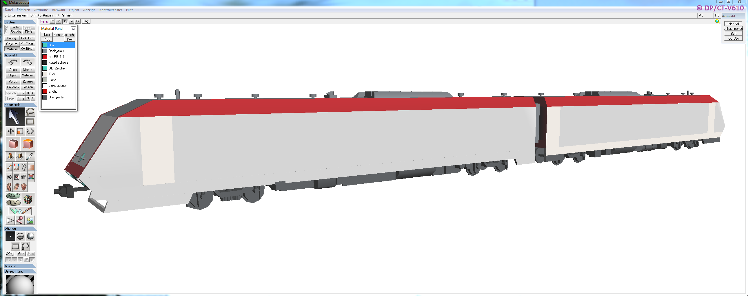 Dies geschah in der Software „Metasequoia“. Leicht zu erkennen ist die noch sehr rudimentäre Geometrie. Ein Pendolino lässt sich hier nur mit etwas Fantasie erkennen.