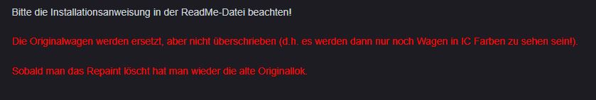 2. Beim Stöbern bzgl verfügbaren Repaints bin ich des Öfteren auf die Anmerkung gestoßen, dass nach Installation des Repaints keine anderen Lackierungen mehr möglich sind, bis es wieder entfernt ist. Ich verstehe das so, dass wenn ich z.B. von Bremen nach Oldenburg ein Szenario mit einem IC2-Repaint erstelle auch ausschließlich DOSTOS im IC-Look verkehren können und ich z.B. für den RE1 gar nicht die verkehrsrote Variante auswählen könnte. Ist das richtig und betrifft das alle Repaints? Weil bei manchen stand dieser Hinweis nicht.