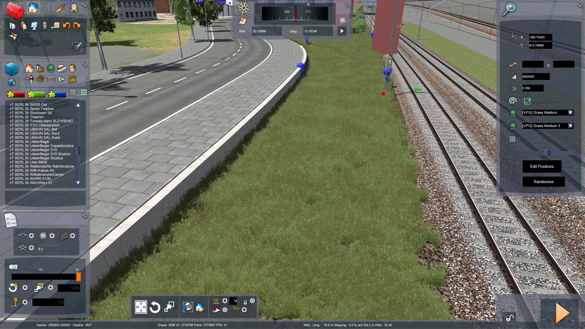 Darf ich Dir noch einen kleinen Tipp geben zur Verwendung des VP-Gras. Du hast sehr oft das VP-High Gras in einer sehr hohen Zahl (4000000) gesetzt, dies wirkt beim Vorbeifahren auf einer eingleisigen Strecke für mich sehr wuchtig. An einigen Stellen zum Beispiel Prenzlauer Alle und Ausfahrt Tunnel Hauptbahnhof habe ich es für mich geändert (siehe Screenshots). Meine Empfehlung ist VPG-Medium Version zu nutzen und nur den Wert zwischen 1500000 - 2500000 einsetzen. Du kannst es ja gerne für den letzten Teil zu Testzwecken zwischen Grünau und Königs Wusterhausen ausprobieren. Ich habe mal zum Vergleich Original und meine Änderung als Screenshot.