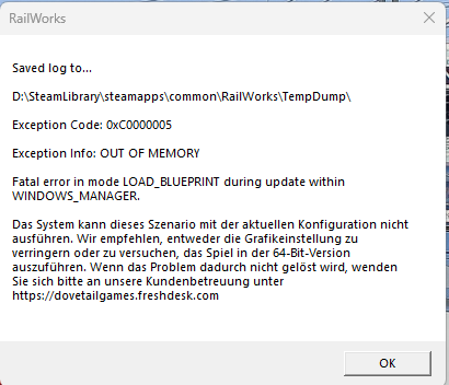 • Hab Kuju als Backup gezogen, dann gelöscht und bei Steam auf Fehler überprüft. Habe jetzt einene Sauberen Kuju ordner aber kriege weiterhin crashes. Ich hänge crashdumb an sowie ein Screenshot der Fehlermeldung.rail-sim.de/forum/wcf/attachment/585323/rail-sim.de/forum/wcf/attachment/585324/