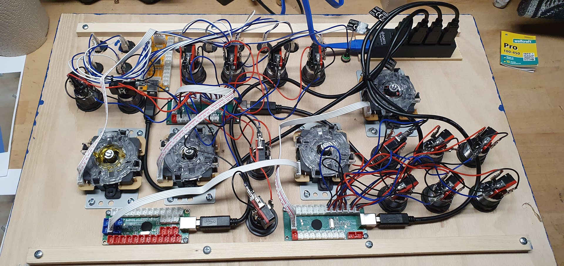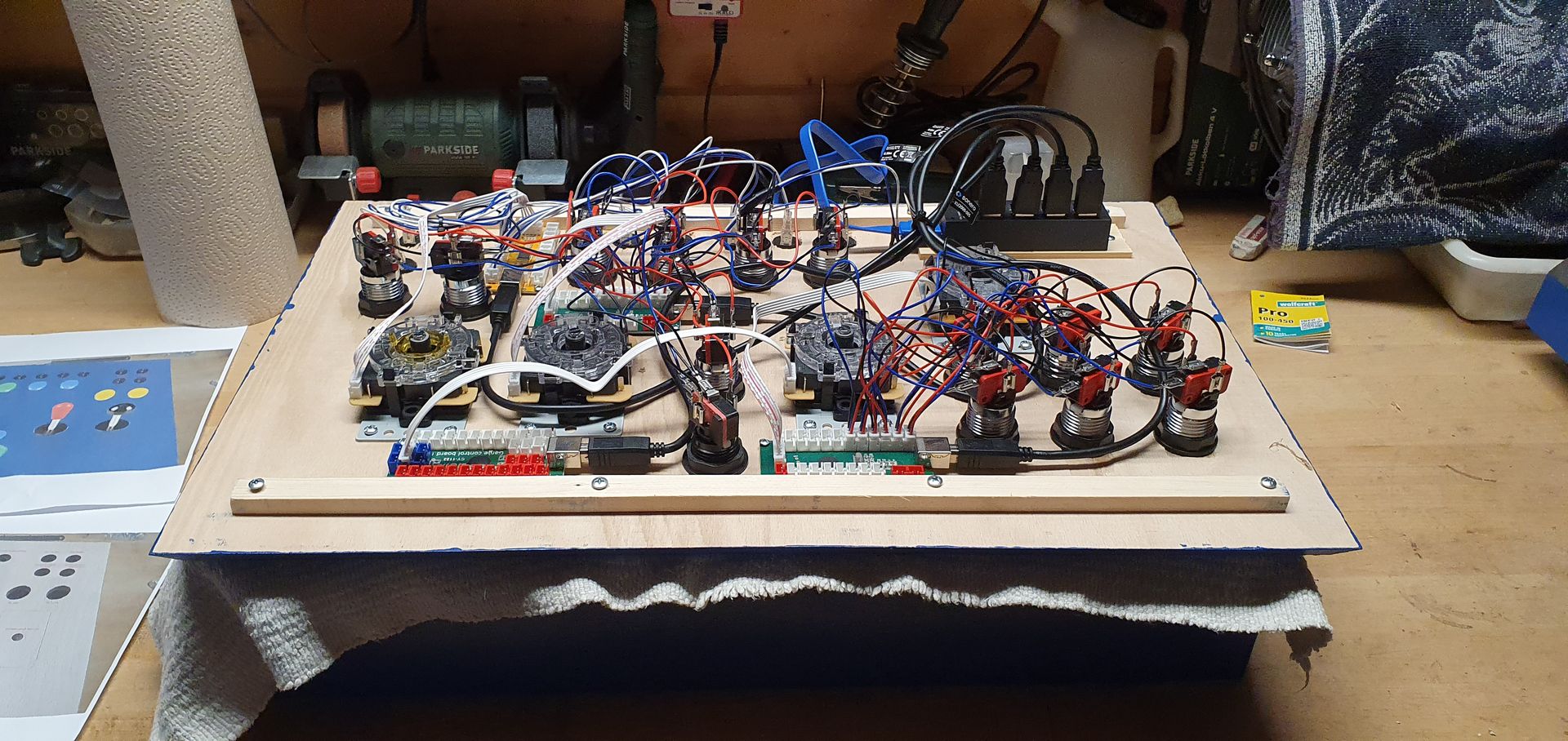 Die Schalter und Hebel, Controller, Platinen, USB ist so angebracht, daß man auch ohne Box die Kopfplatte in einem Tisch versenken kann. Ausserhalb nur einen USB-Anschluss. Auch ein Schlüsselschalter ist vorhanden, für die Aktivierung der Batterie.