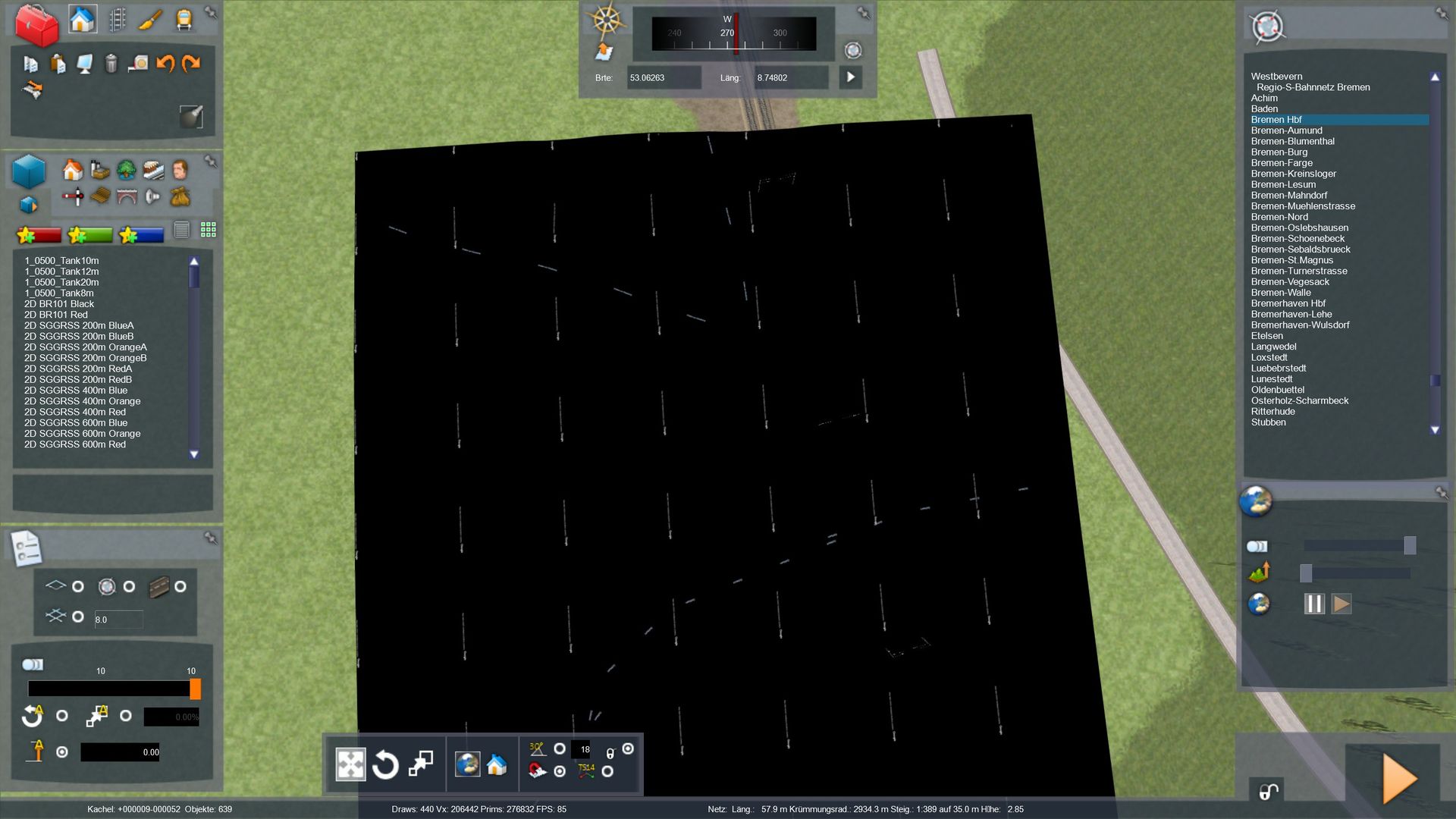 Ich musste vor kurzem meinen TS neu installieren. Dementsprechend musste ich auch meinen GoogleMaps Key wieder neu im TS eintragen. Jetzt habe ich ein merkwürdiges Phänomen. Ich wollte am Regio-S-Bahnnetz Bremen weiter arbeiten und habe dazu das Overlay aktiviert. In Bremerhaven funktioniert es auch wunderbar. In Bremen bekomme ich allerdings nur schwarze Tiles siehe Bilder. Hat das schon mal jemand gehabt bzw. eine Idee was das Problem sein könnte?